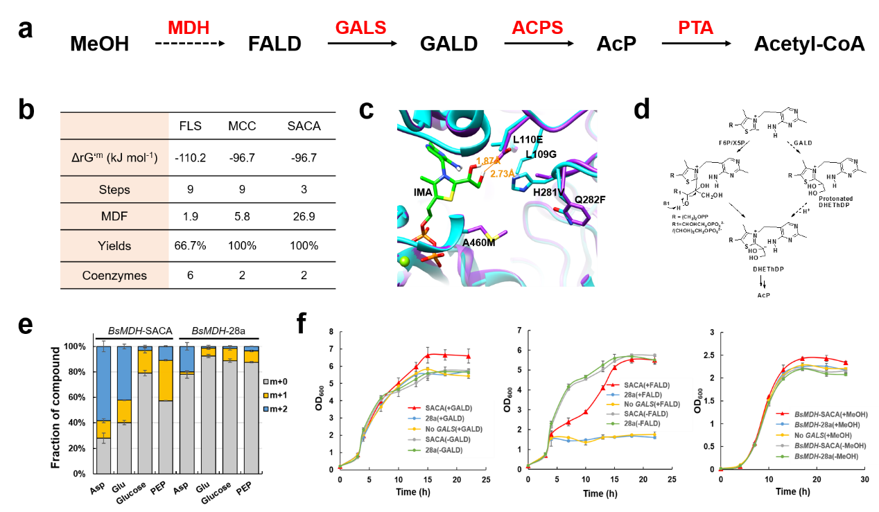 We named this pathway as the Synthetic Acetyl-CoA (SACA) pathway, where two molecules of formaldehyde would be transferred into one molecule of acetyl-CoA through only three steps (Fig.1a). We calculated the thermodynamics of the SACA pathway and compared it with previously reported pathways (Fig.1b). Surprisingly, the SACA pathway has very strong driving force in vivo. The glycolaldehyde synthase was further engineered for formaldehyde condensation (Fig.1c) and an acetyl-phosphate synthase was obtained for acetyl-phosphate synthesis (Fig.1d). We firstly demonstrated the feasibility of the SACA pathway in vitro. Then we tried to track intracellular metabolic fluxes using 13C-labeled formaldehyde. Unfortunately, we were only able to detect double 13C-labeled TCA metabolites in cell lysates rather than in vivo. What is causing this? We suspected that the possible cause is the high toxicity of formaldehyde. Then we added methanol dehydrogenase to the SACA pathway and repeated the experiment with 13C-labeled methanol as the substrate (Fig.1e). Subsequently, we used different carbon sources for growth experiments, confirming that the SACA pathway can significantly increase biomass (Fig.1f).