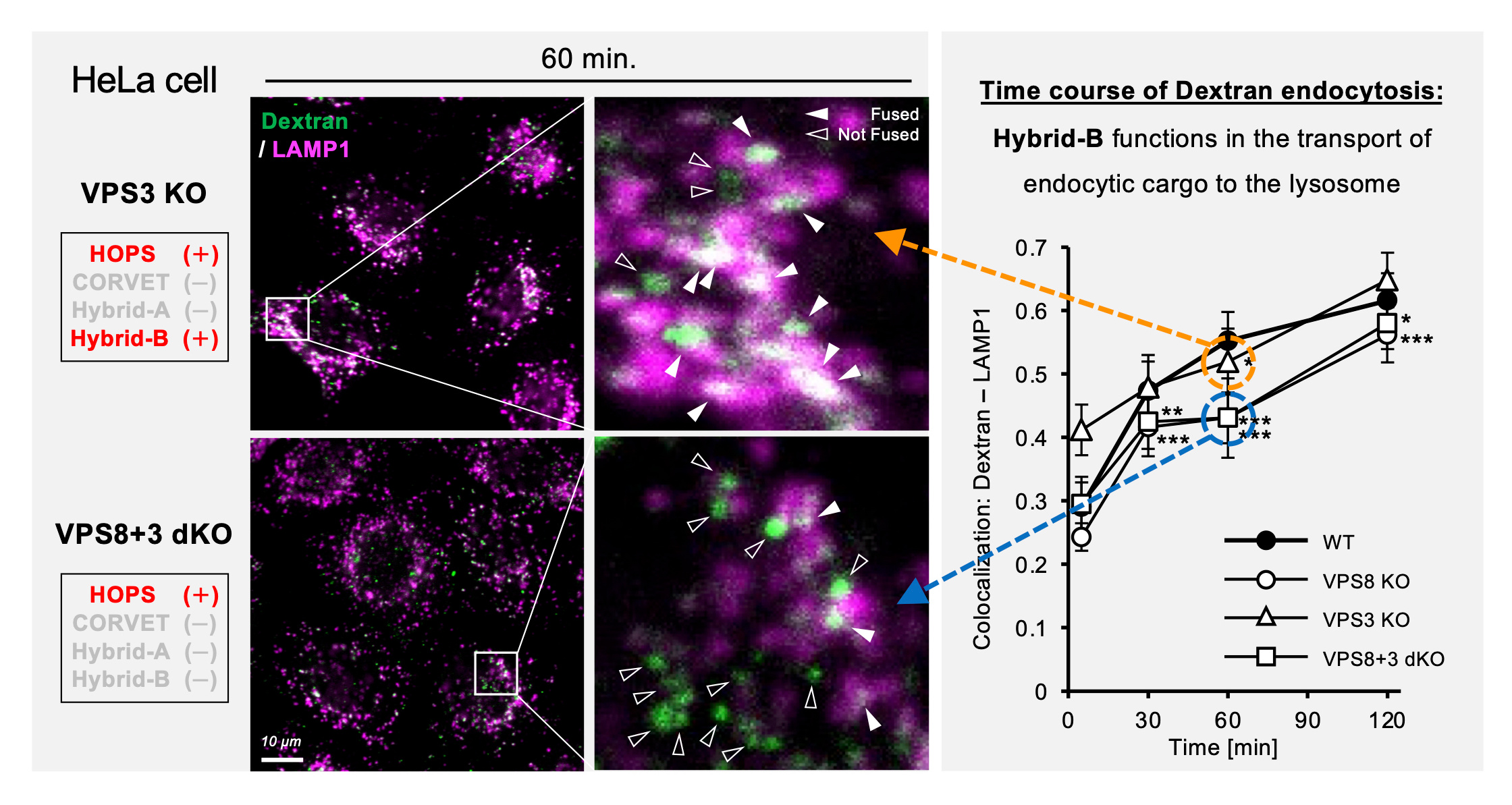 Figure 2. Hybrid-B functions in macropinocytosis. The trafficking of fluorescence-labeled dextran to lysosome was compared between VPS3 KO and VPS8+3 double KO (dKO) cells at the time point of 60 minutes after pulse (microscopic images). The right panels are enlarged pictures of the inset in the left panels. The time course of dextran transport to lysosome was evaluated by Pearson’s correlation coefficient between dextran and LAMP1 signals (graph). The corresponding data to VPS3 KO (orange) and VPS8+3 dKO (Blue) were marked and connected with circles and arrows to the microscopic images.