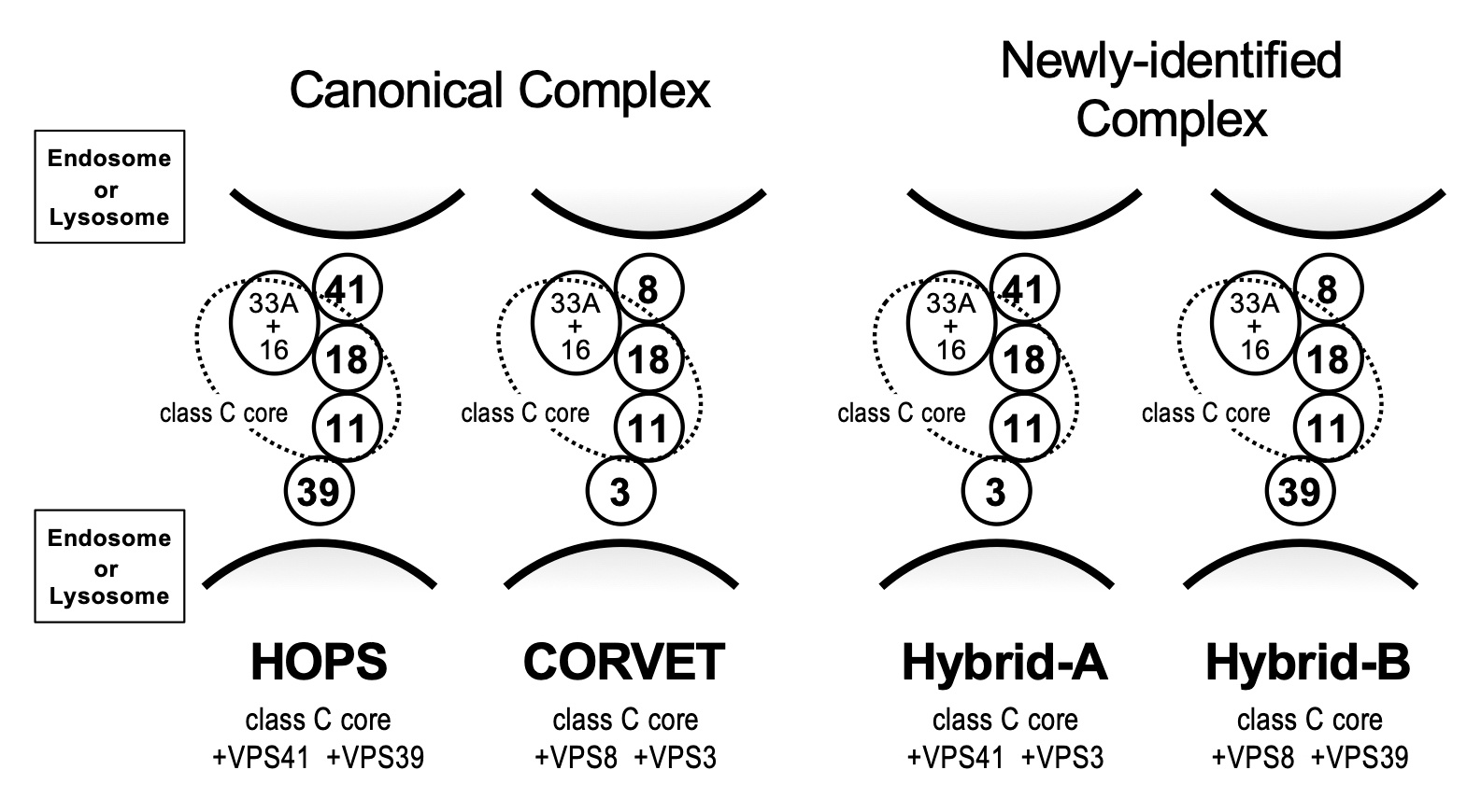 The tethering complexes HOPS and CORVET are multi-protein complexes that regulate the fusion of vesicles such as endosomes, autophagosomes, and lysosomes in endocytosis and autophagy pathways. The importance of these complexes in intracellular vesicular trafficking has been elucidated by many research groups. In the present study, we have shown that there are hybrid types of complexes formed by different combinations of subunits which constitute HOPS and CORVET, and that this complex functions in a certain type of endocytosis.