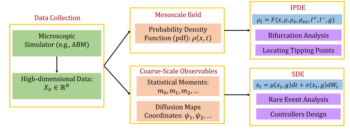- Identify Surrogate Models: Use machine learning to develop black-box mesoscopic IPDEs, ODEs, or, after further dimensional reduction, macroscopic mean-field SDEs.