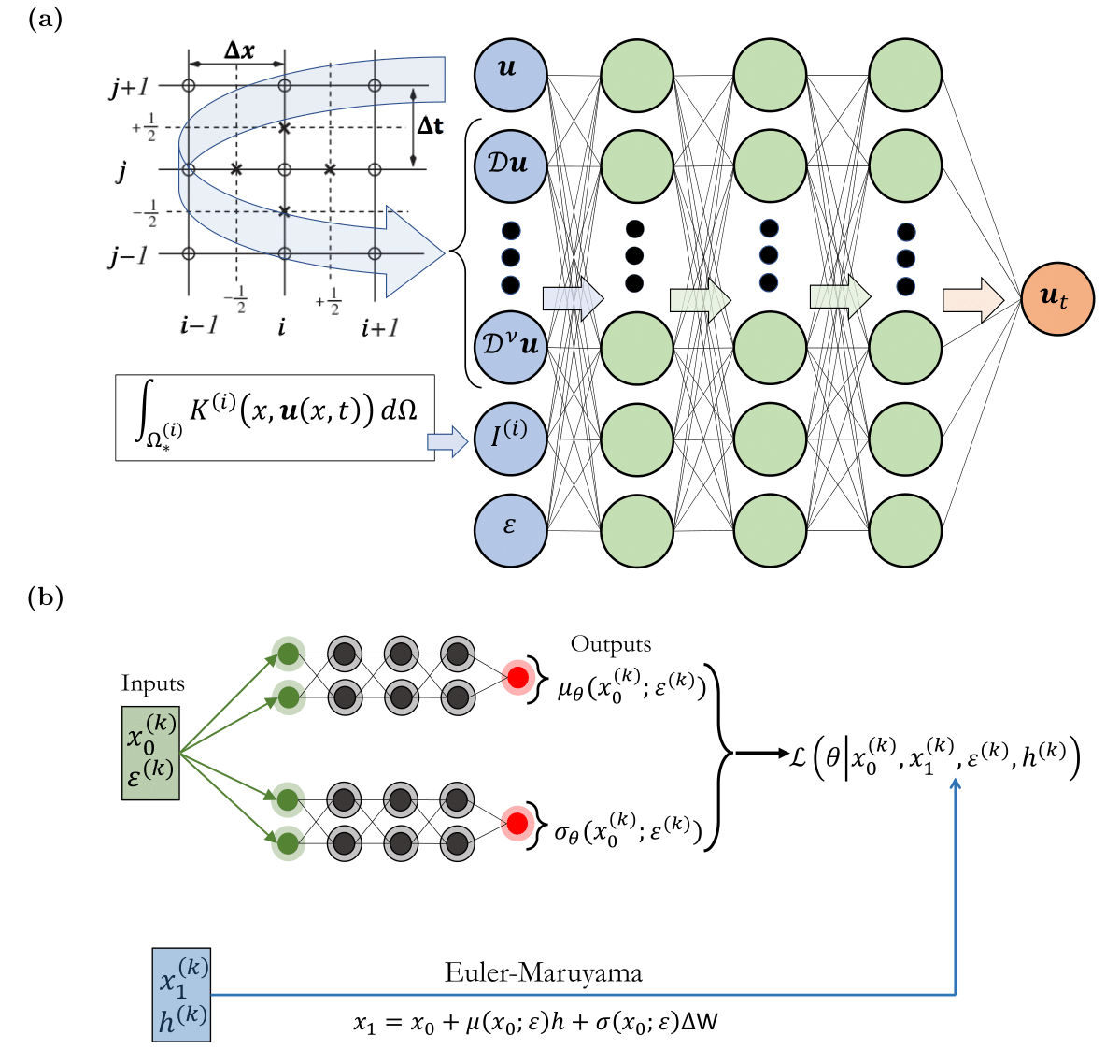 Schematic of the neural networks used for constructive machine learning assisted surrogates. (a) Convolutional Neural Network (CNN). The input is constructed by convolution operations, i.e. a combination of sliding Finite Difference (FD) stencils, and, integral operators, for learning mesoscopic models in the form of Integro-PDEs; the inputs of the Integro-PDE are local and/or global features .