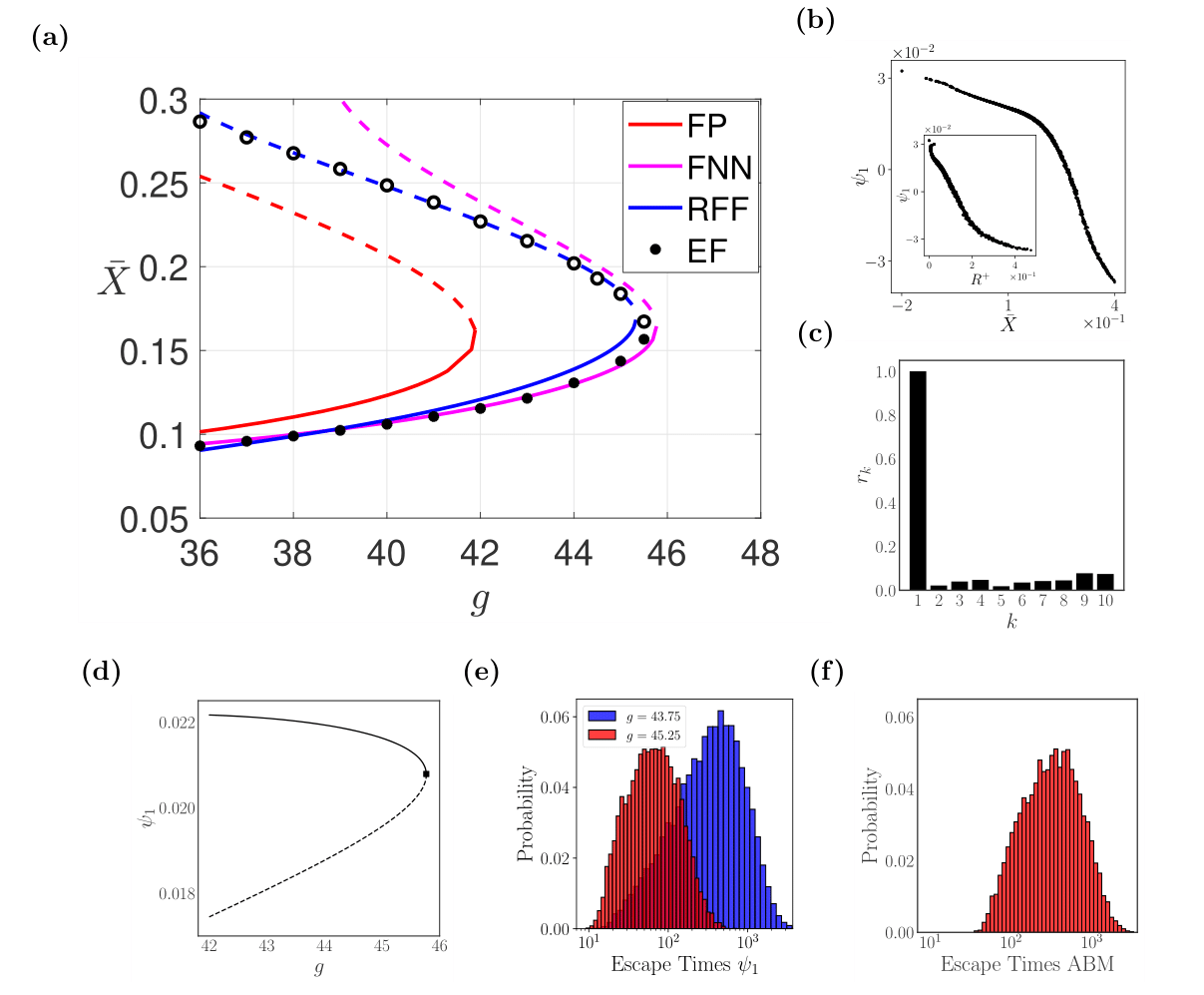 Panel (a): This looks at how a key factor (represented by "") affects the overall stability of the market. Imagine a switch: above a certain value of "" the market might behave differently. The neural networks (FNN & RFF) accurately locate the tipping point whereas the analytical Fokker-Planck (FP) model does not. Panels (b) and (c): Here feature selection algorithms show the corresponding low-dimensional behavior. These focus on the overall behavior of the group, instead of the individual behavior of the agents (like investors) within the market simulation. They look at how their preferences and actions change based on the overall market state. Panel (d): This describe the market stability in terms of the low-dimensional machine-learning derived variable. Panels (e) and (f): These explore how quickly things can change in the market simulation when the system is close to a tipping point. They show how long it takes for the market to left the stable state and undergo to a catastrophic shift in the presence of noise.