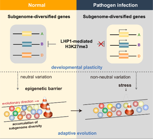 In summary, this study discovered LHP1 as a key factor regulating subgenomic divergence and disease resistance genes by quantitatively integrating multi-omics data via a machine learning scheme and genetic validations. Under normal conditions, LHP1-mediated epigenetic buffering system protects normal development from environmental changes and leads to the variation accumulation between subgenomes. Pathogen infection eliminated LHP1 repression, enabling previously unavailable phenotypic variants to surface, thereby releasing defense cascades and facilitating the timely fixation of favorable mutations in particular environmental niches.
