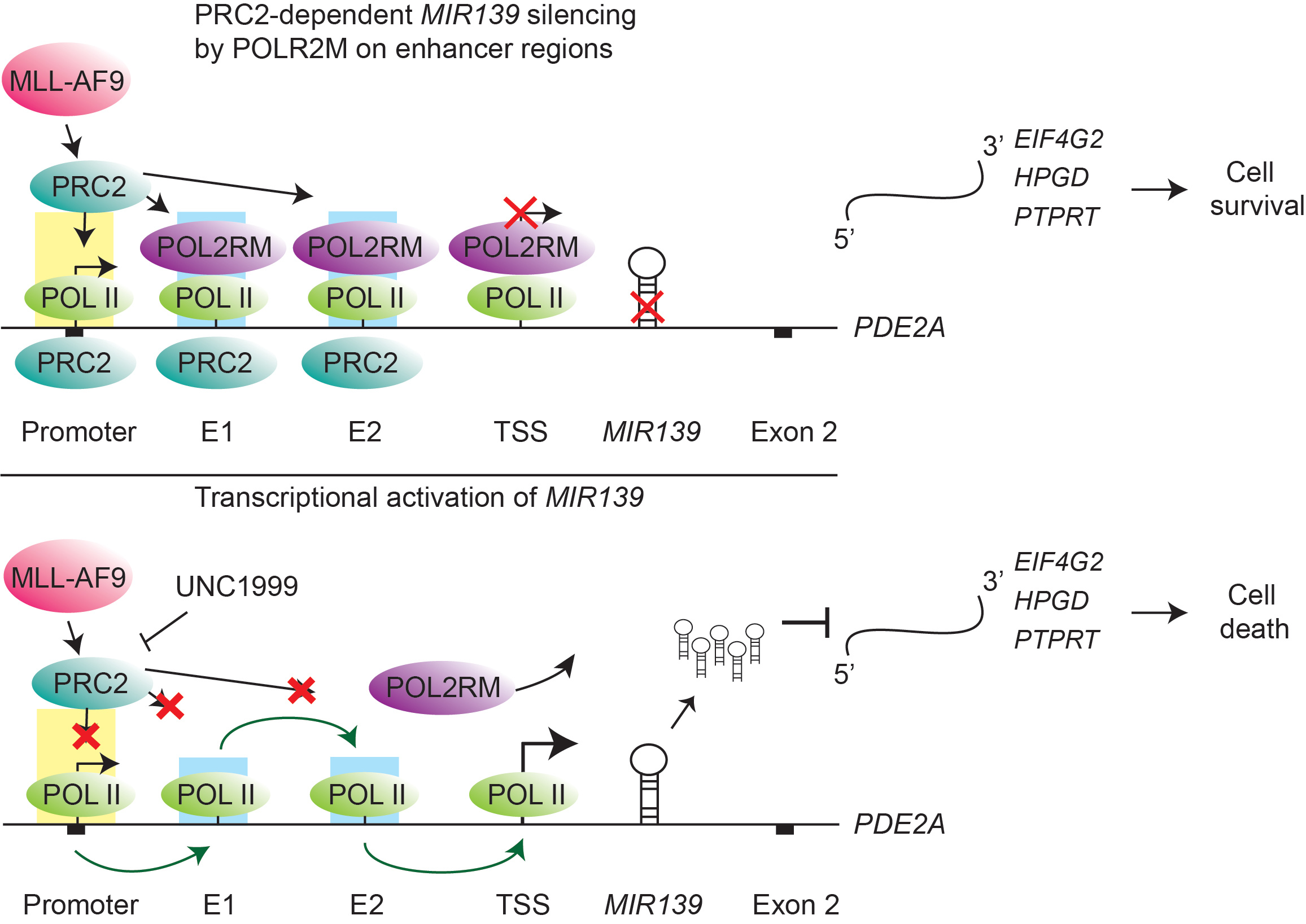 In the top panel, the MIR139 silencing mechanism in MLL-AF9 AML is shown. MLL-AF9 recruits PRC2 to the promoter, E1, E2, and the TSS of the PDE2A locus. POLR2M is recruited to E1, E2, and the TSS. POLR2M silences the transcription of MIR139, while the transcription of the host gene is unaffected. In the bottom panel, the mechanism of transcriptional activation by PRC2 inhibition and POLR2M depletion is shown. POLR2M depletion and PRC2 inhibition by UNC1999, which abrogates POLR2M interaction with the enhancers, results in transcription of MIR139. Increased miR-139 levels results in downregulation of EIF4G2, PTPRT, and HPGD and lead to cell death of MLL-AF9 cells.