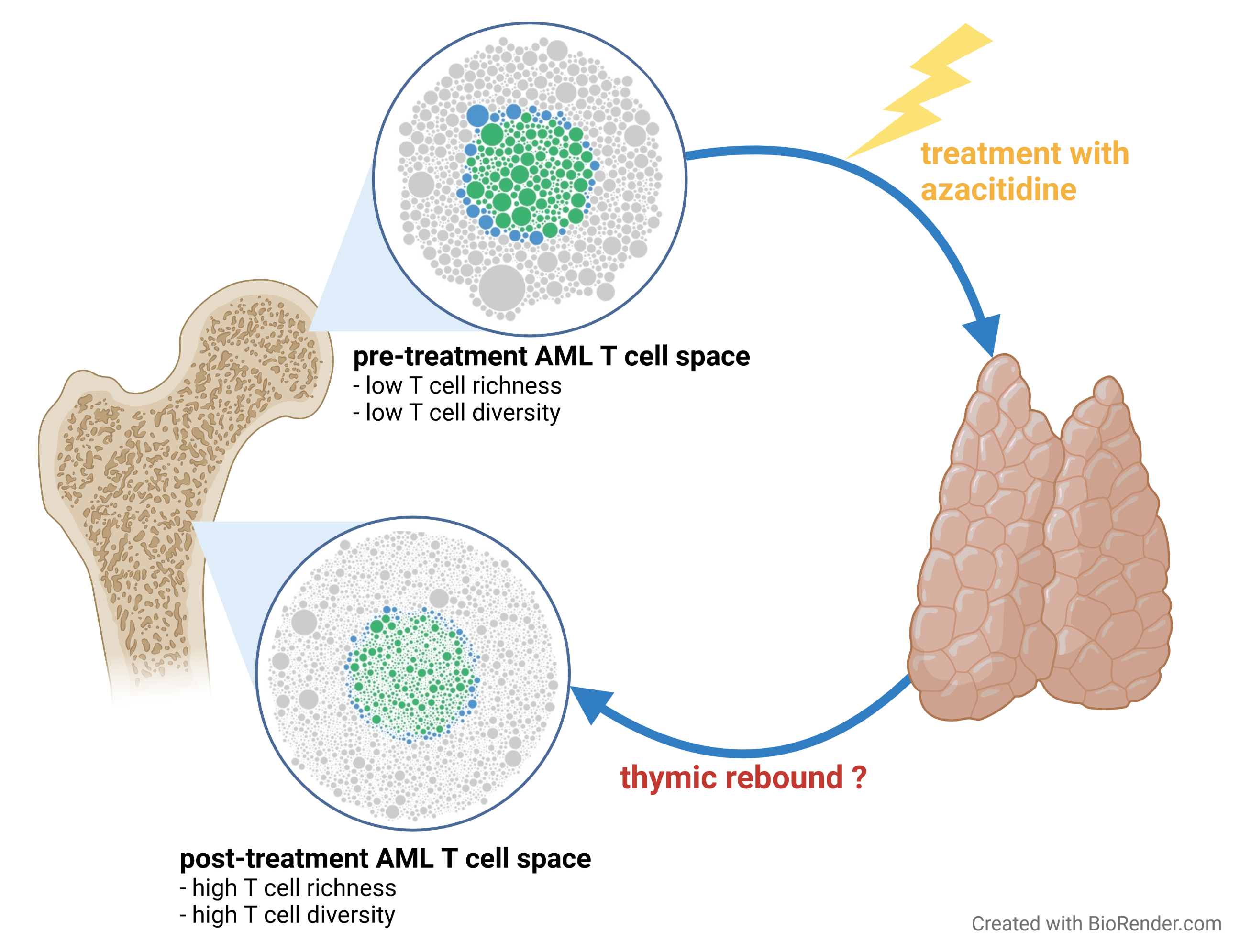 Taken together, these results imply that high up-front T cell diversity may facilitate antigen-driven anti-leukemic immune responses in AML patients. Moreover, azacitidine is able to boost T cell richness even in some patients that show rather clonal T cell repertoires prior to treatment. The boost of T cell richness in the bone marrow niche is an interesting pattern compatible with some sort of thymic reactivation in these patients in response to treatment. Overall, this data underlines the so far underestimated prognostic role of the bone marrow T cell niche in AML.