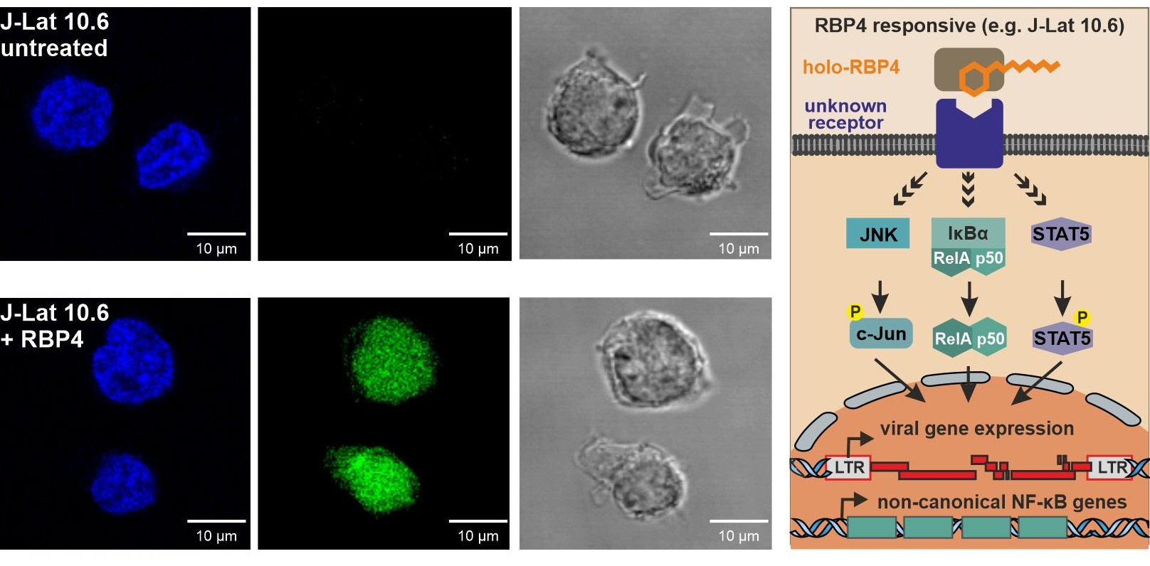 RBP4 circulates in two isoforms: holo-RBP4 (retinol-bound) and apo-RBP4 (retinol-free). In the bloodstream, holo-RBP4 associates with transthyretin (TTR) to prevent renal clearance. Upon retinol delivery, RBP4 shifts to the apo form, which is subsequently filtered through the kidneys and excreted. This raised a central question: is the retinol required for RBP4-mediated HIV latency reversal activity? To answer this, we joined forces with the research group of Frank Rosenau and found that only holo-RBP4 reactivates HIV, while free forms of retinoids, such as retinol, retinal and retinoic acid are inactive. Furthermore, removal of retinol from circulating holo-RBP4 abolished its activity as LRA. Thus, the physiological retinol-RBP4 complex seems essential for reactivation of latent HIV proviruses, yet this effect is independent on retinol delivery and its conversion to retinoic acid.