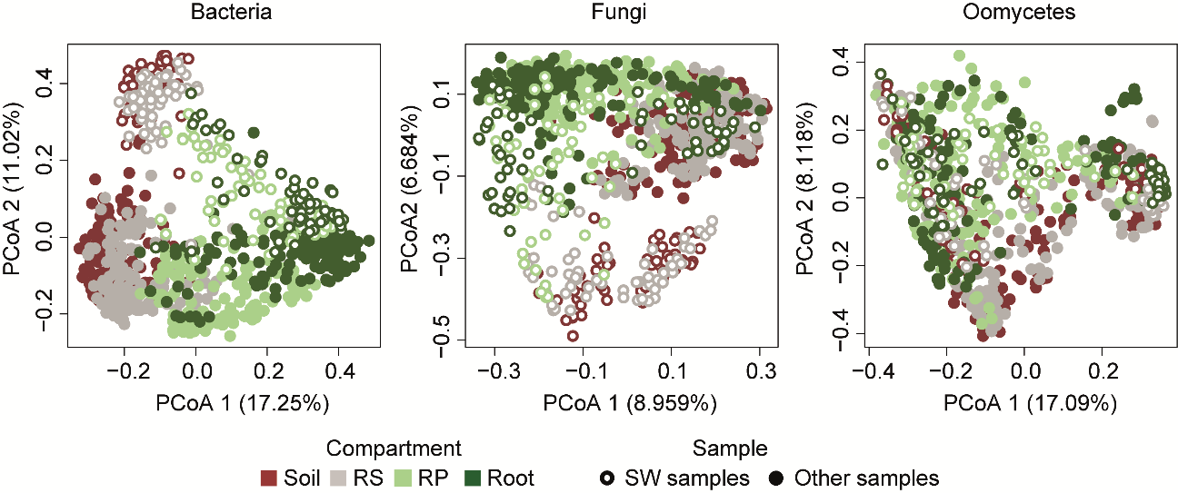 This first data analysis told us many things, but one of the most striking observations was the robustness of the composition of bacterial communities in root tissues. Despite large geographical distances and different soil conditions and climate between sites, the composition of bacterial communities in the root compartment was more similar across sites than the surrounding soil communities. This similarity in root microbiota composition was not as pronounced for fungal and oomycetal communities, although a host-filtering effect can also be observed for these microbial groups (Figure 4). Based on these first observations, we were excited to pursue the harvesting campaign for two more years. This successive sampling allowed us to assess the robustness of these community patterns over time, and to determine the extent to which year-to-year variation in environmental conditions affect microbial community composition.
