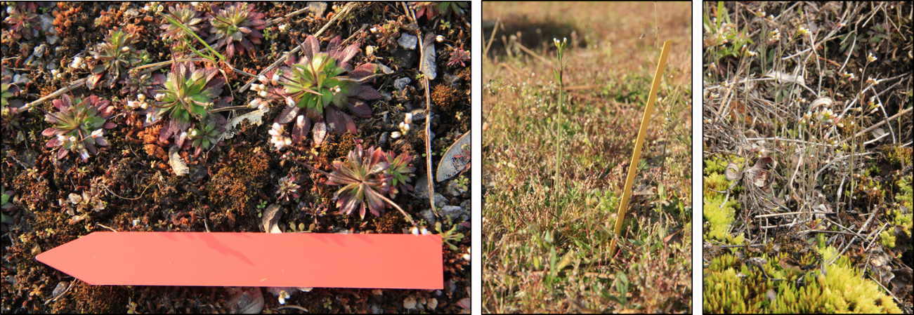 Stéphane and I teamed up with Samuel Kroll and Alfredo Mari, two PhD students working in the group of Eric Kemen at the time, who also took advantage of the trips to address their own research questions (Figure 1). After all the preparatory work and gearing up for the unknown, the four of us drove to each of the initially 16 locations and met up with our local collaborators, who would show us where A. thaliana grows and help us to identify them. This last point, although it may seem trivial, turned out to be of extreme importance. One would think that plant scientists who had been working on A. thaliana for a number of years would easily recognize their model plant in the wild. Well, you would be surprised. And we were too: when growing A. thaliana in the greenhouse, we very often get big, happy plants with huge rosettes; however, this is very far away from what these plants look like in nature. In our very first harvesting excursion, we had a very hard time to spot these tiny plants and even sometimes to differentiate them from closely related plant species such as Draba verna (Figure 2). After collecting plants from so many sites over several consecutive years, I now can see immediately the difference, but it was definitively not so clear at the time…