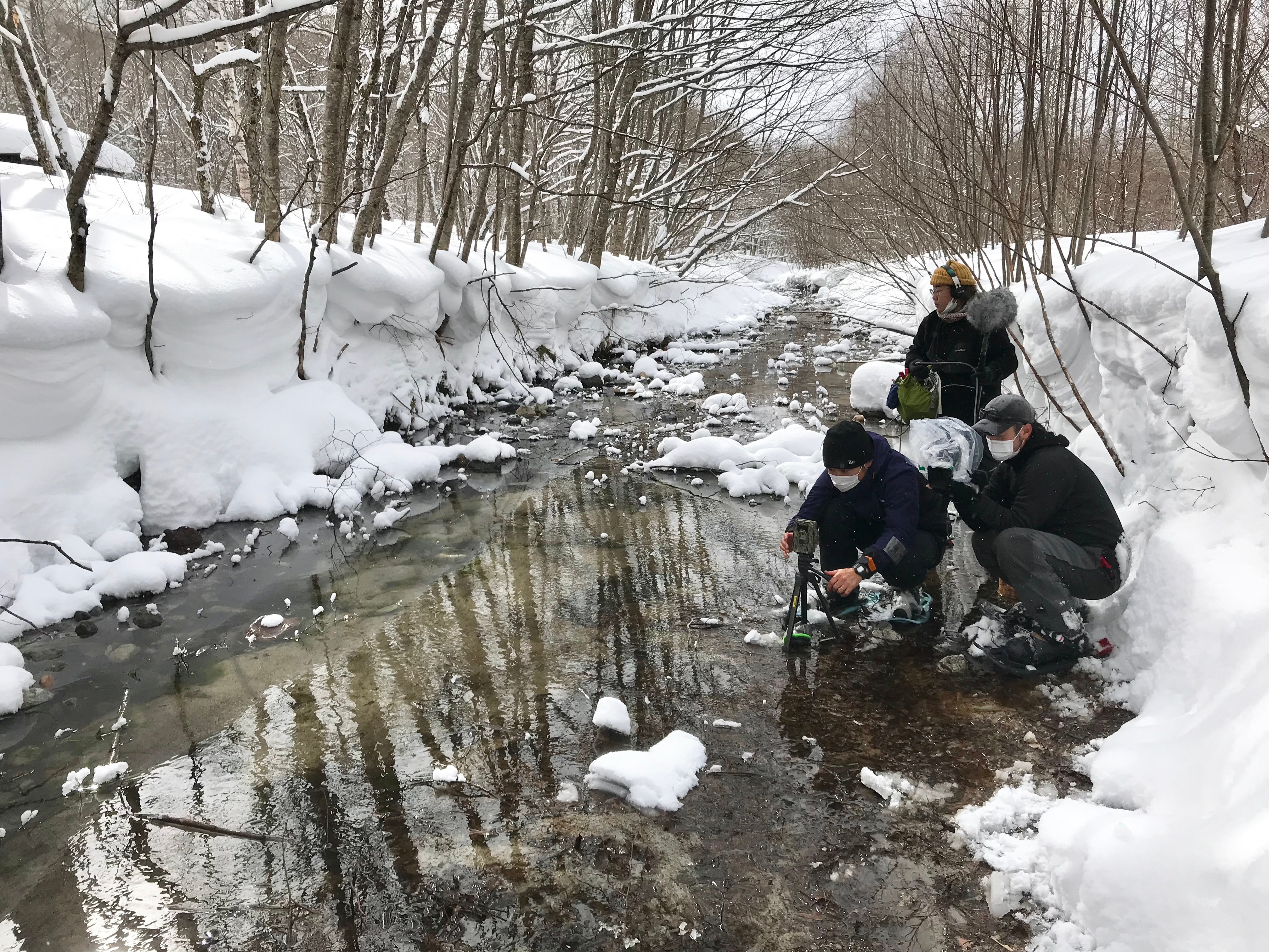 Fig 4. A film crew poised, waiting for the moment of snow monkeys’ fishing in the frigid Kamikochi (photo by Koji TOJO).