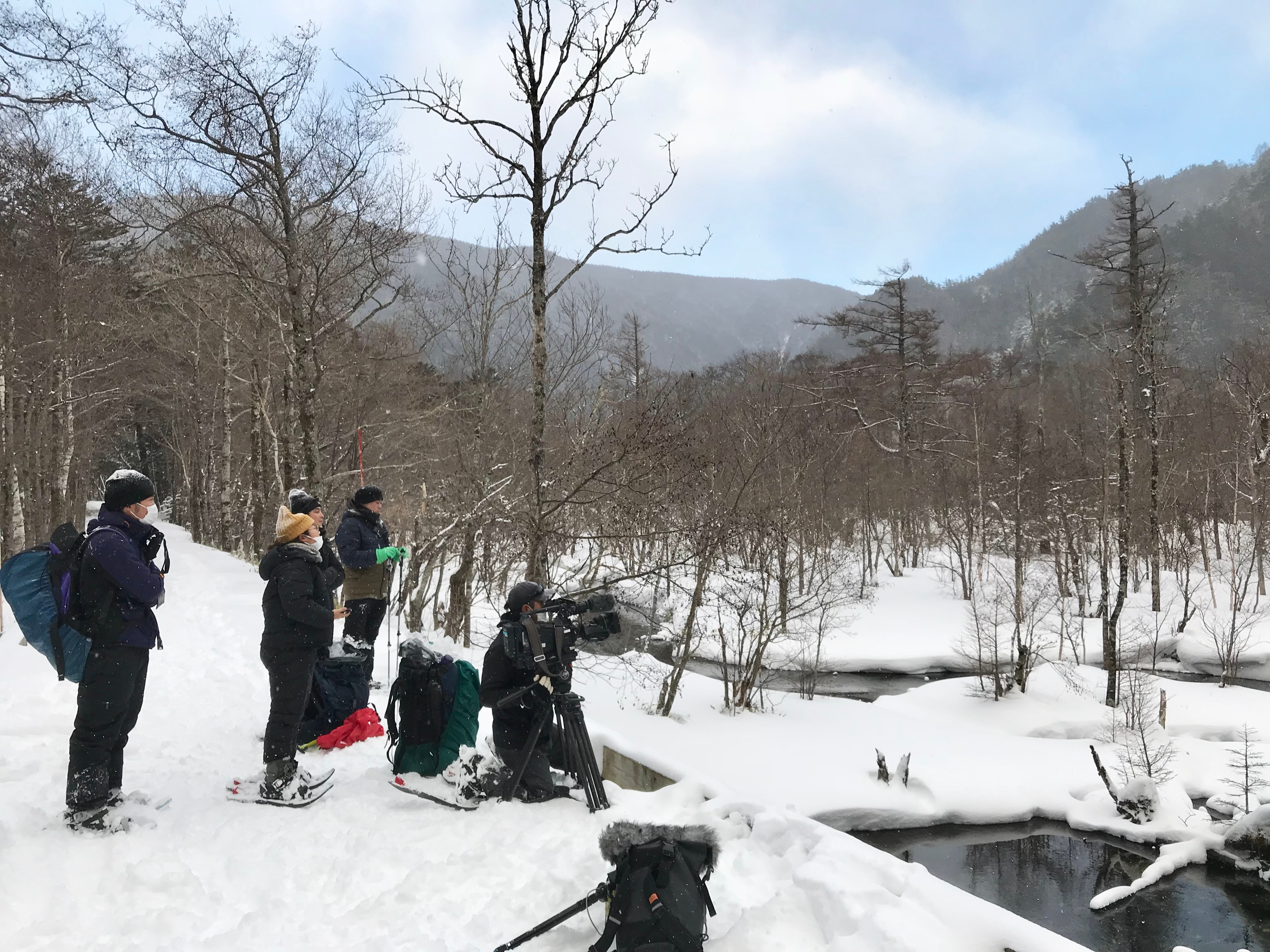 Fig. 5. A film crew poised, waiting for the moment of snow monkeys’ fishing in the frigid Kamikochi (photo by Koji TOJO).