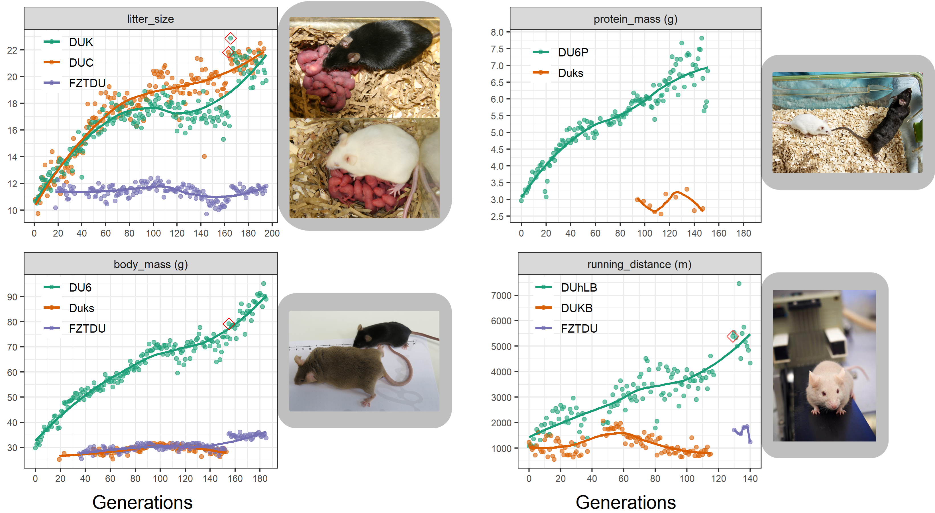 At the Research Institute for Farm Animal Biology (FBN) in Dummerstorf, Germany, a unique set mouse lines were generated over the course of more than 50 years of artificial selection. These lines have evolved impressive phenotypes of high fertility, body size and endurance fitness. To our knowledge, this is the longest selection experiment ever conducted on mice and we were keen on peering into the genomes of these unique animals, in order to uncover known and new loci associated to the traits under selection.