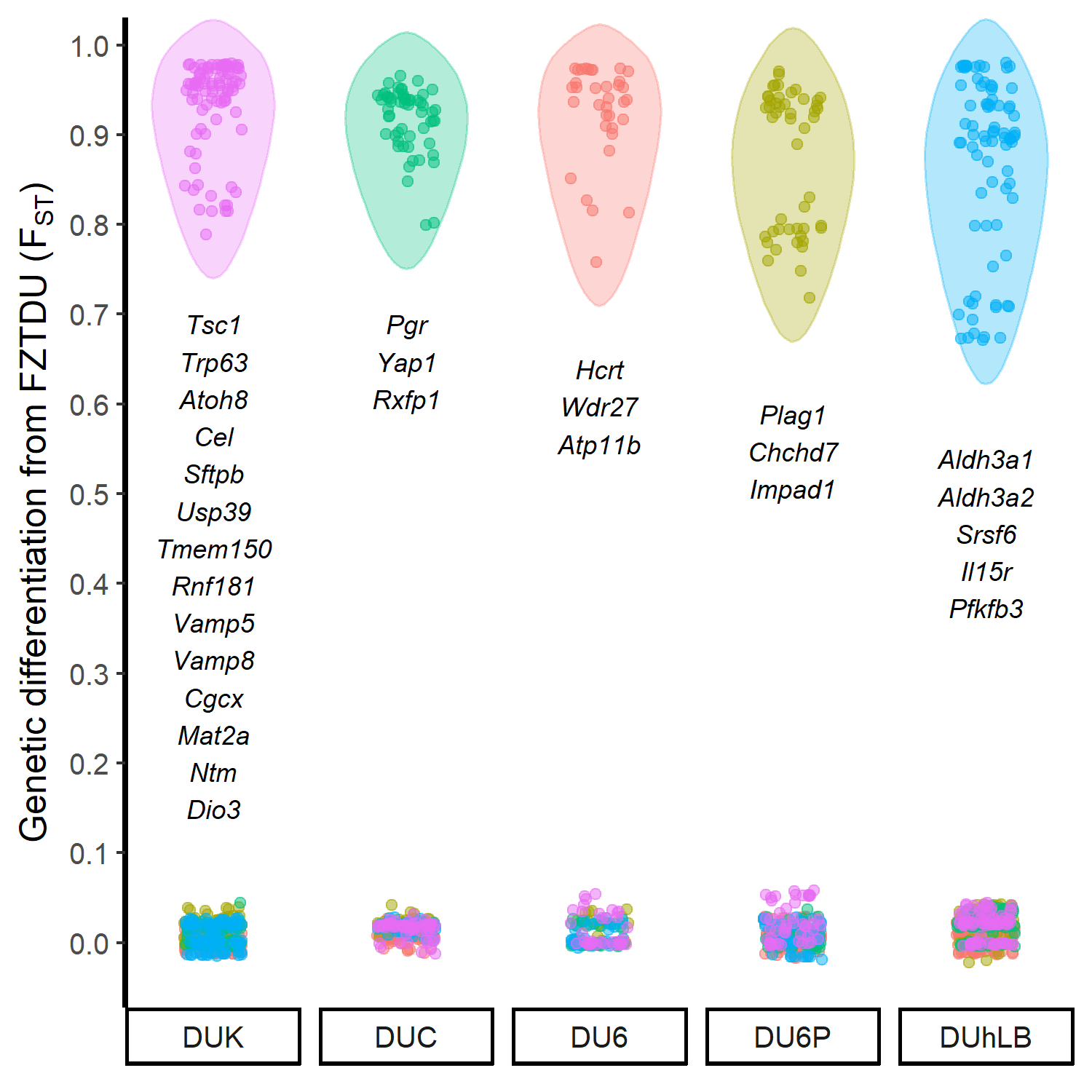 The historical resources at our disposal were thus limited, so we tried to come up with an alternative approach that would at least give us an idea of which genes could be involved in the evolution of the selected traits. First, we obtained the genomewide genetic differentiation of each selected line relative to the control line (the control line as a proxy of the founder population, exposed only to genetic drift). We then looked for regions of line-specific high genetic differentiation, each one corresponding to a genomic location in which only the target line is highly differentiated from the control line, while all remaining lines are undifferentiated. This approach revealed a number of candidate genes, some of which are already known to be relevant in the biology of fertility, body mass, muscle growth, and endurance.