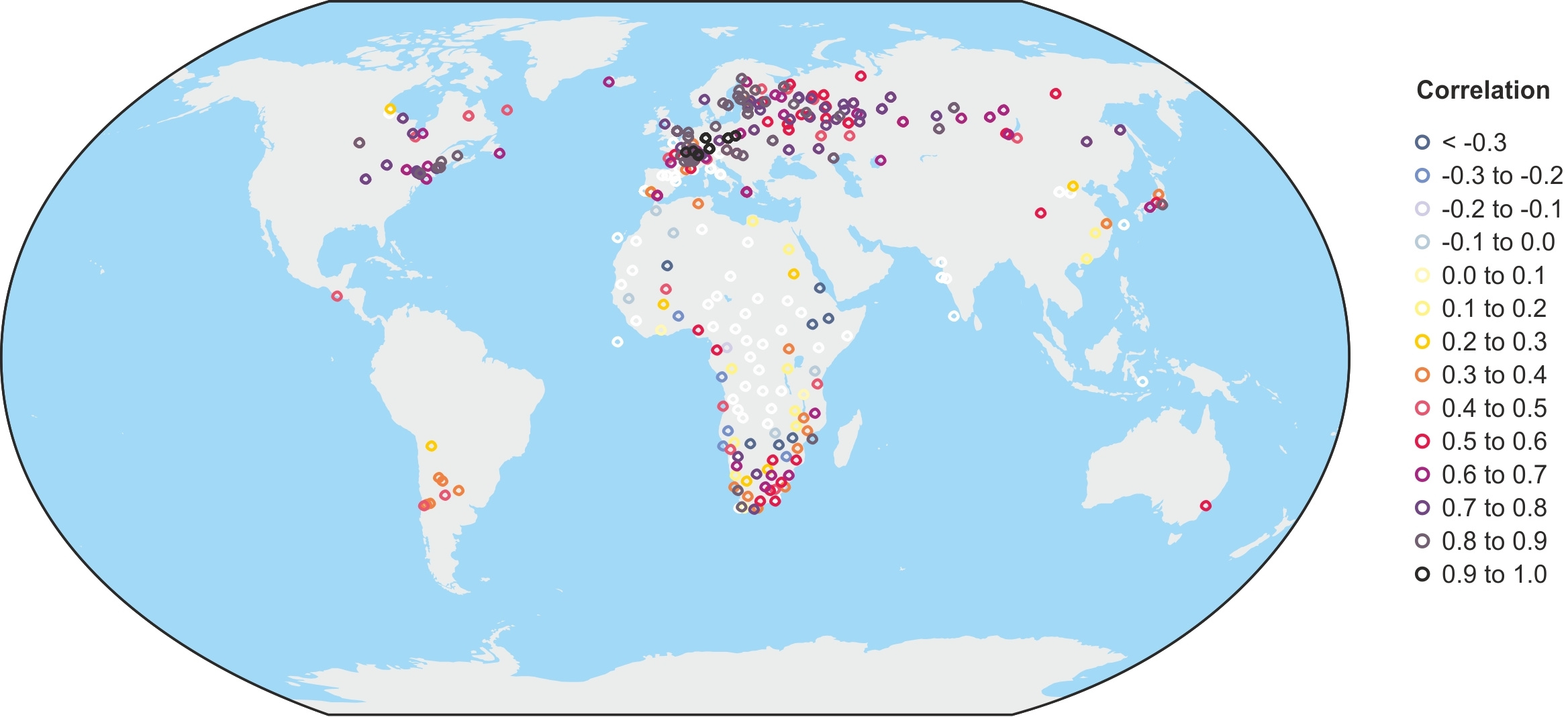 Map of Pearson correlation coefficients between documentary data and forward modelled data. Grey dotted circles indicate series where no evaluation was possible.