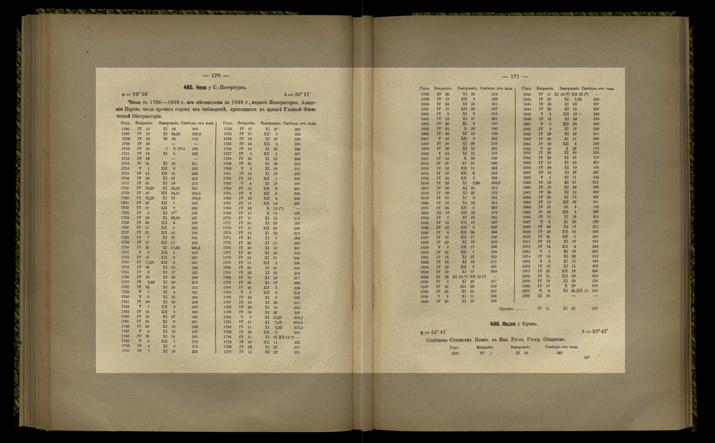 Amidst my data quest, I stumbled upon two extraordinary Russian publications dating back to the days of the Russian Empire that merit special mention: Written in Cyrillic, they contain a wealth of freeze-up and break-up records of rivers and lakes across the vast expanse of the empire, with over 50 records covering the early 19th century and a total of 21 records going beyond 1800 CE. These records, most of which are hitherto unknown to Western scholars, allow for unprecedented insights into past cold-season temperature variability spanning from Eastern Europe all the way to the Russian Far East coast.