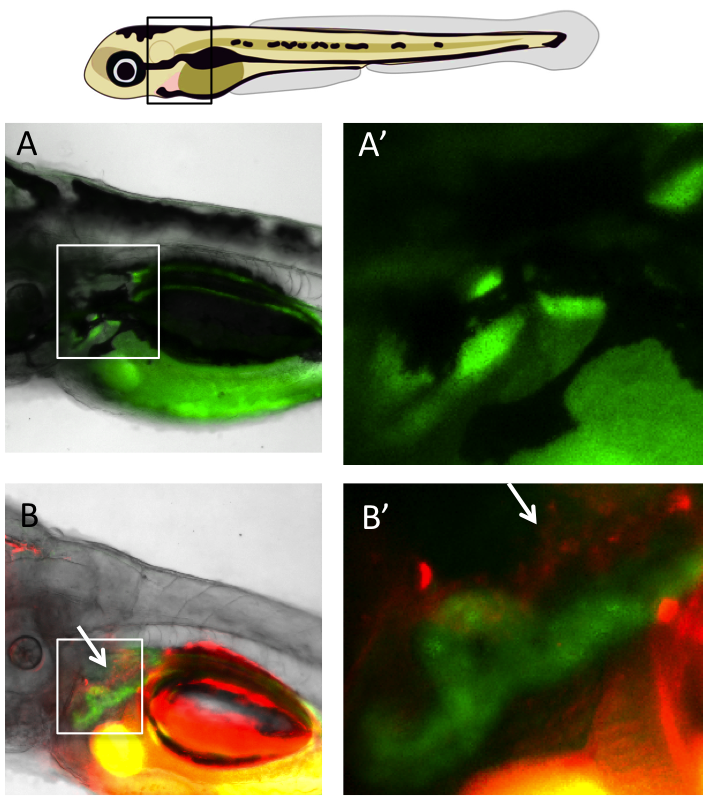 Top panel: Schematic of a zebrafish. The black boxed area is enlarged in the panels on the left.