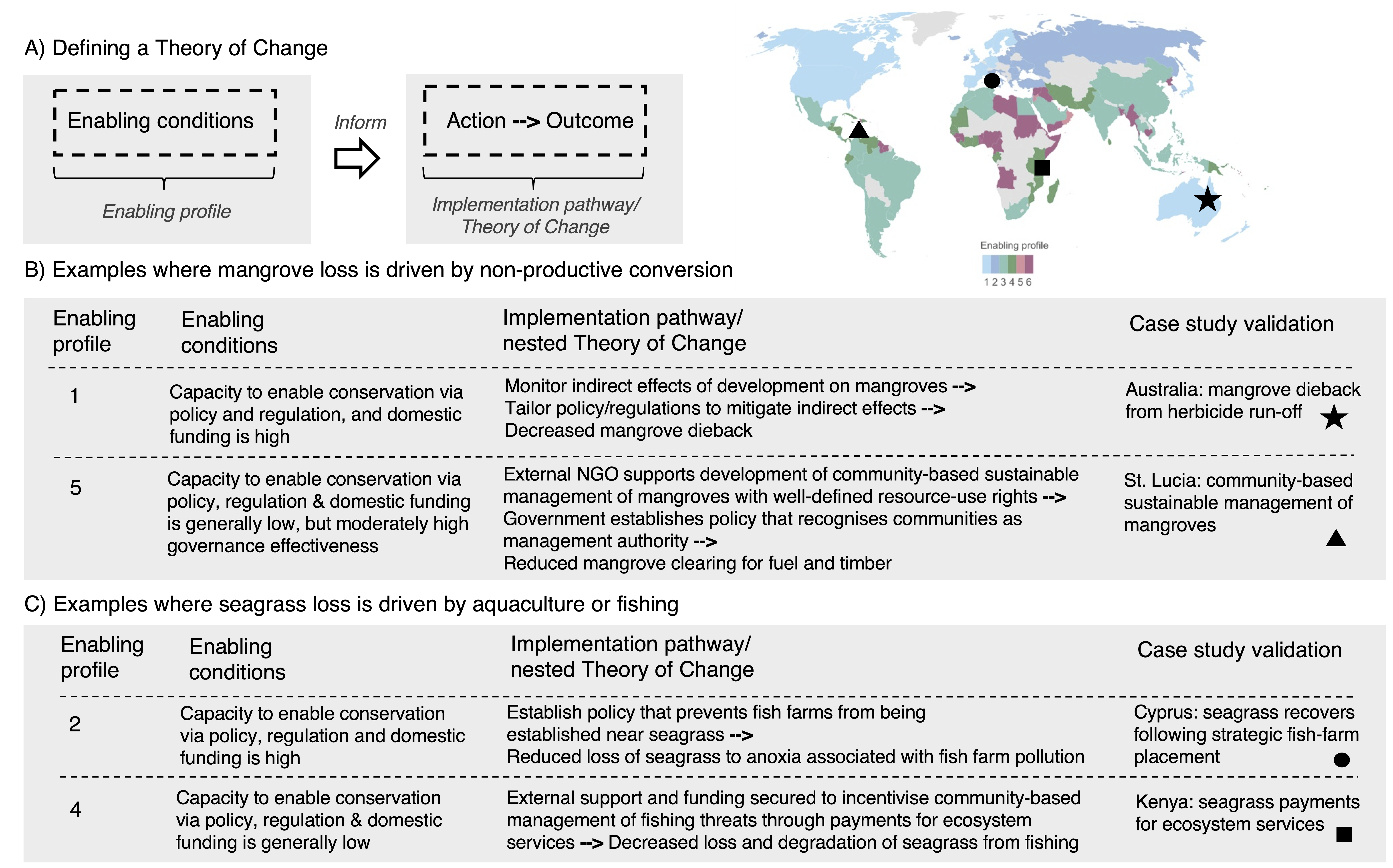 To demonstrate the approach, we developed enabling profiles for coastal 'blue carbon' ecosystems - seagrass, mangroves, and saltmarsh - to inform nested theories of change for their conservation. The figure below highlights some key examples, but case-studies can also be explored interactively with this web application.