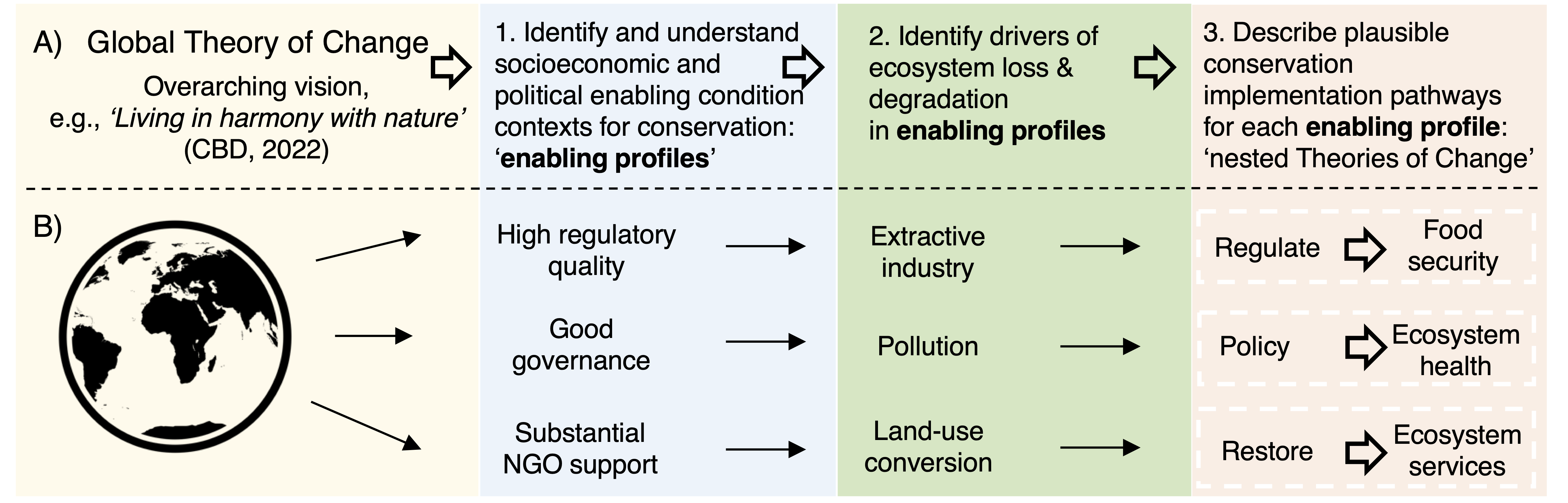 Our paper provides a framework for operationalising global theories of change, such as the KM-GBF, in three steps - outlined in the figure below.