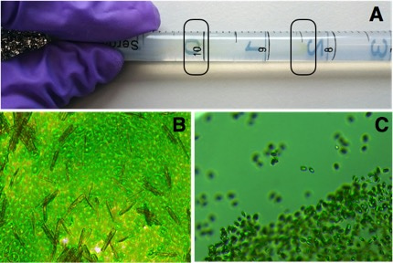 Fig. 2: Steps of isolating Chlamydomonas from a mixed phytoplankton community. A: The end of a pipette race. Fast swimmers (dark circle near ‘8’ mark) have formed a band further away from the dark end (gloves), slow swimmers (dark circle near ‘10’ mark) have formed streaks closer to the dark end. B: Mixed community on agar plate (diatoms and green algae). C: “Clean” culture of Chlamydomonas after plating on agar.