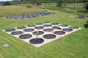 Fig. 1: The mesocosm set-up at the Freshwater Biological Association. Of 20 mesocosms, half are kept warmed to 4ºC above ambient. All mesocosms were inoculated with the same mixture of phytoplankton and zooplankton eleven years ago. They are open to air-borne colonisers and between-pond dispersal.