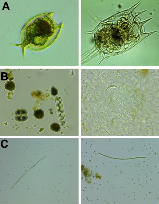Fig. 3: Mixed communities from the Dorset ponds. A: Two different species of heterotrophs found at greater prevalence in the heated habitat at the time of sampling (spring). B: Communities in the warmed pond (here, photographs randomly selected for pond 9 and pond 14, respectively) are more diverse and have larger biomass than communities from the ambient pond, as seen in panel C, where communities are dominated by few species.