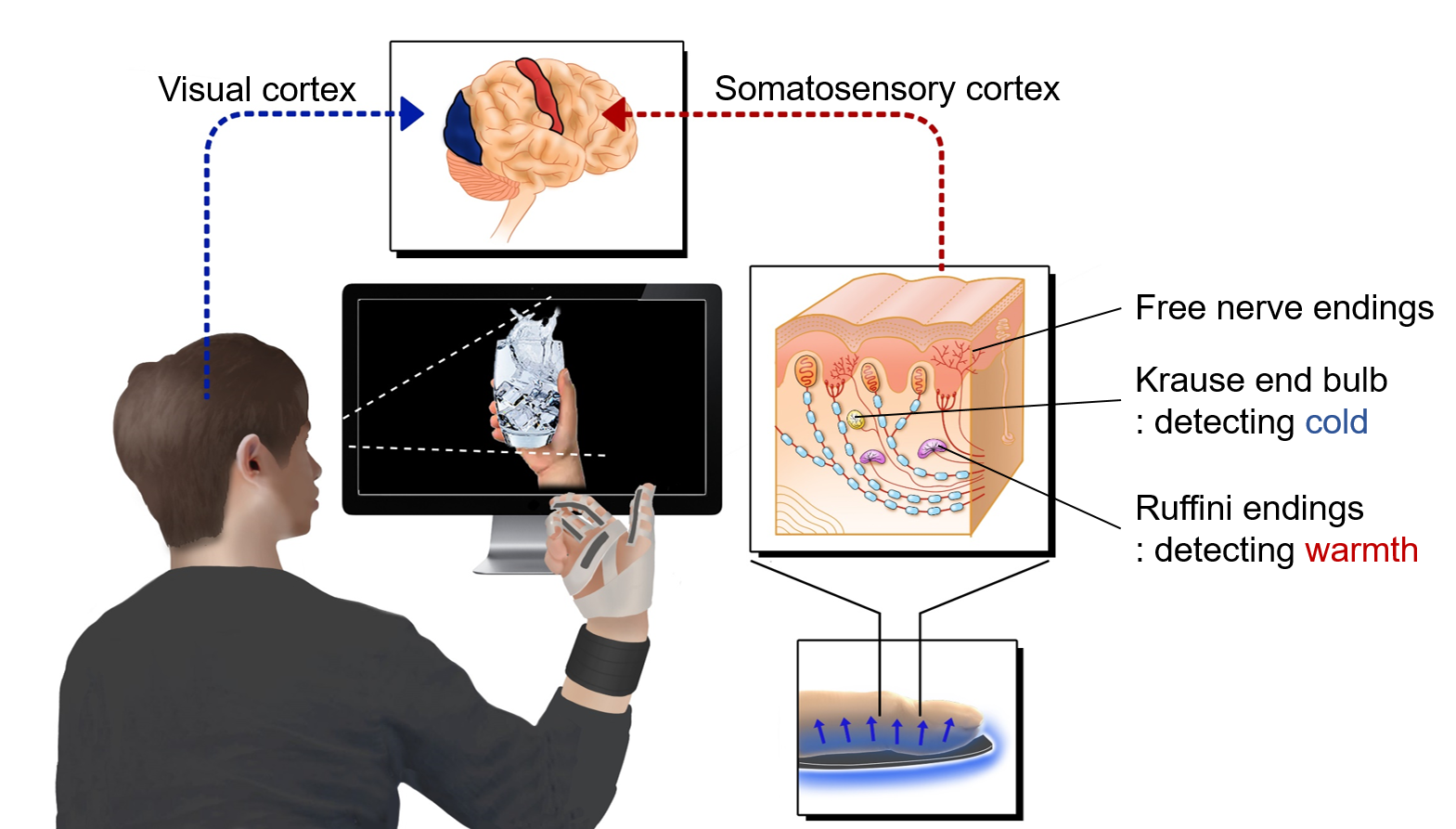 Figure 1. Illustration of the operation of thermal display glove system linked to the virtual environment and physiological process. The person wears the proposed thermal display glove and grab the cold cup in the virtual space. The person receives two different stimuli from the VRs: visual and thermal ones. From two external stimulations, the brain as if it were a real situation and the user can feel realism from the virtual environment.
