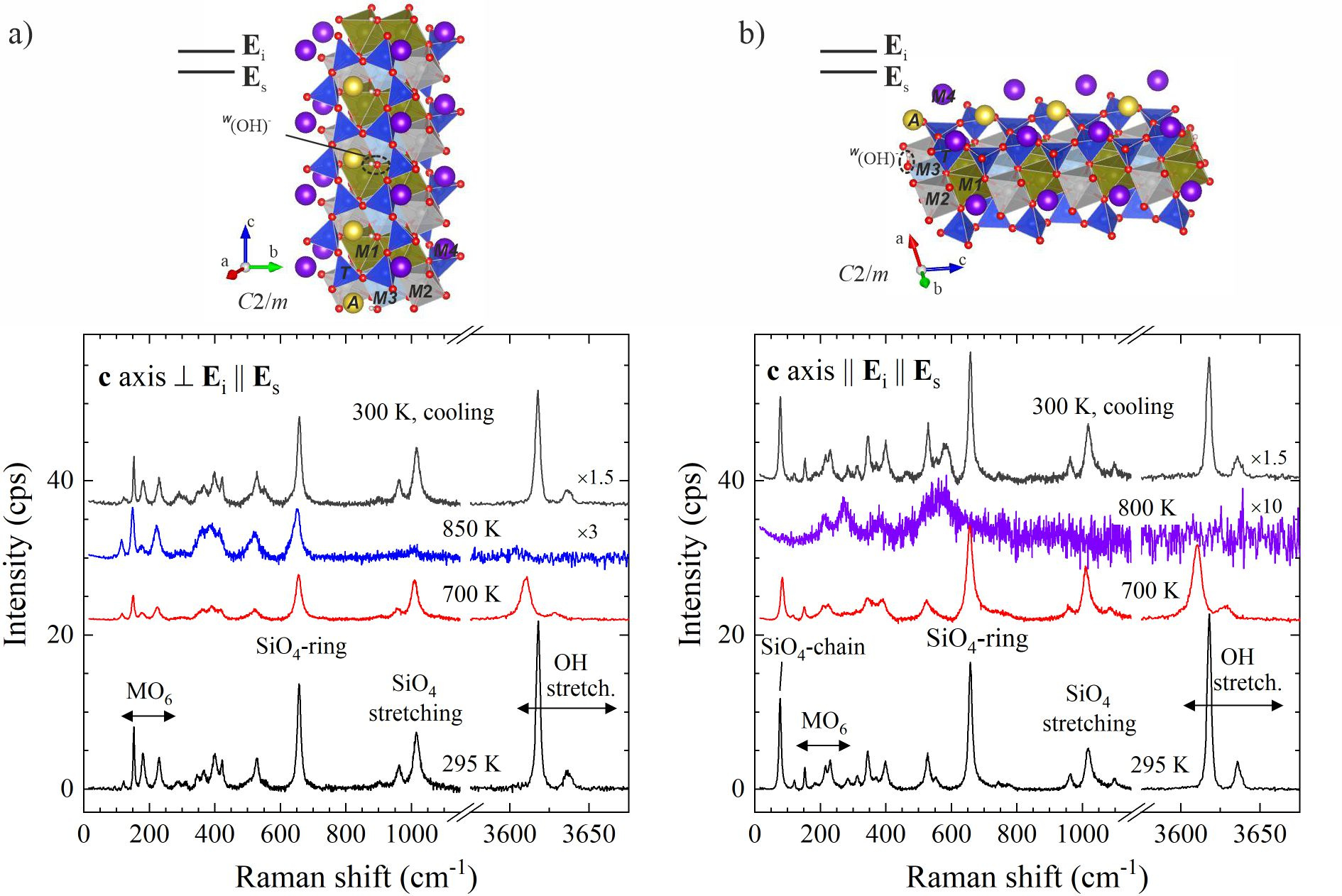 Within the framework of a long-term project on the atomistic mechanism of reduction-oxidation (redox) processes in Fe-bearing rock-forming minerals such as amphiboles, we have applied in situ Raman spectroscopy at elevated temperatures to several amphiboles with various compositions. We have discovered a quite astonishing phenomenon: the existence of reversible dynamic oxidation, consisting of delocalization of electrons from the octahedrally coordinated iron cations and delocalization of H+ from the W-site (OH)-. The experimental evidence for this was the disappearance of the OH-stretching Raman peaks above a certain temperature along with a change the Raman scattering related to MO6 vibrations (see Fig. 1a), which were recovered after cooling down to room temperature. The Raman experiments were done in a parallel polarized scattering geometry (polarization of the laser Ei parallel to the polarization of the scatted light Es) and with the strips of linked TO4 rings and MO6 octahedra perpendicular to Ei (Fig. 1a), because usually the OH-stretching peaks are better resolved in this geometry. For grunerite (amphibole species with Fe2+ at the M(4) and octahedral sites, and vacant A site) we have decided to measure the spectra also when the TO4-MO6 strips were parallel to Ei, looking for a possible displacive phase transition that could be reflected by the chain mode near 70 cm-1, having much stronger Raman intensity in such a “horizontal” orientation (see Fig. 1b). Actually, we observed even more peculiar feature: at a certain temperature not only the OH-stretching peaks disappear, but also all peaks generated by silicon-oxygen vibrations, like the chains of TO4-rings also “evaporated”. However, apparently the amphibole structure did not collapse, because the “vertical” orientation clearly indicated that amphibole did not undergo any reconstructive phase transition or partial amorphization. Even more astonishing, the spectra in both scattering geometries recover if the sample is heated in an N2 environment, whereas the spectral changes are quenched if a certain threshold temperature is reached on heating in air.