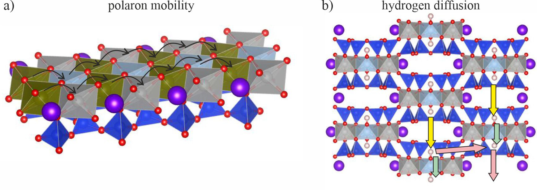 Thus, we provide a solid experimental evidence for highly anisotropic formation of temperature-activated mobile small polarons, the diffusion of which through the mineral bulk occurs exclusively along the strips (see Fig. 2a). Note that in an independent study we have shown that the diffusion of temperature-activated delocalized H+ within the amphibole structure is, conversely, stronger perpendicular to the TO4-MO6 strips; a possible hopping mechanism is sketch in Fig 2b. The presence of external oxygen stimulates the ejection of H+ and thus of electrons from the crystal. Therefore, heating in air results in a unique metastable state with an anisotropic surface-to-bulk gradient in the chemical potential, which is quenched upon cooling down to room temperature. The two main implications of our results are: