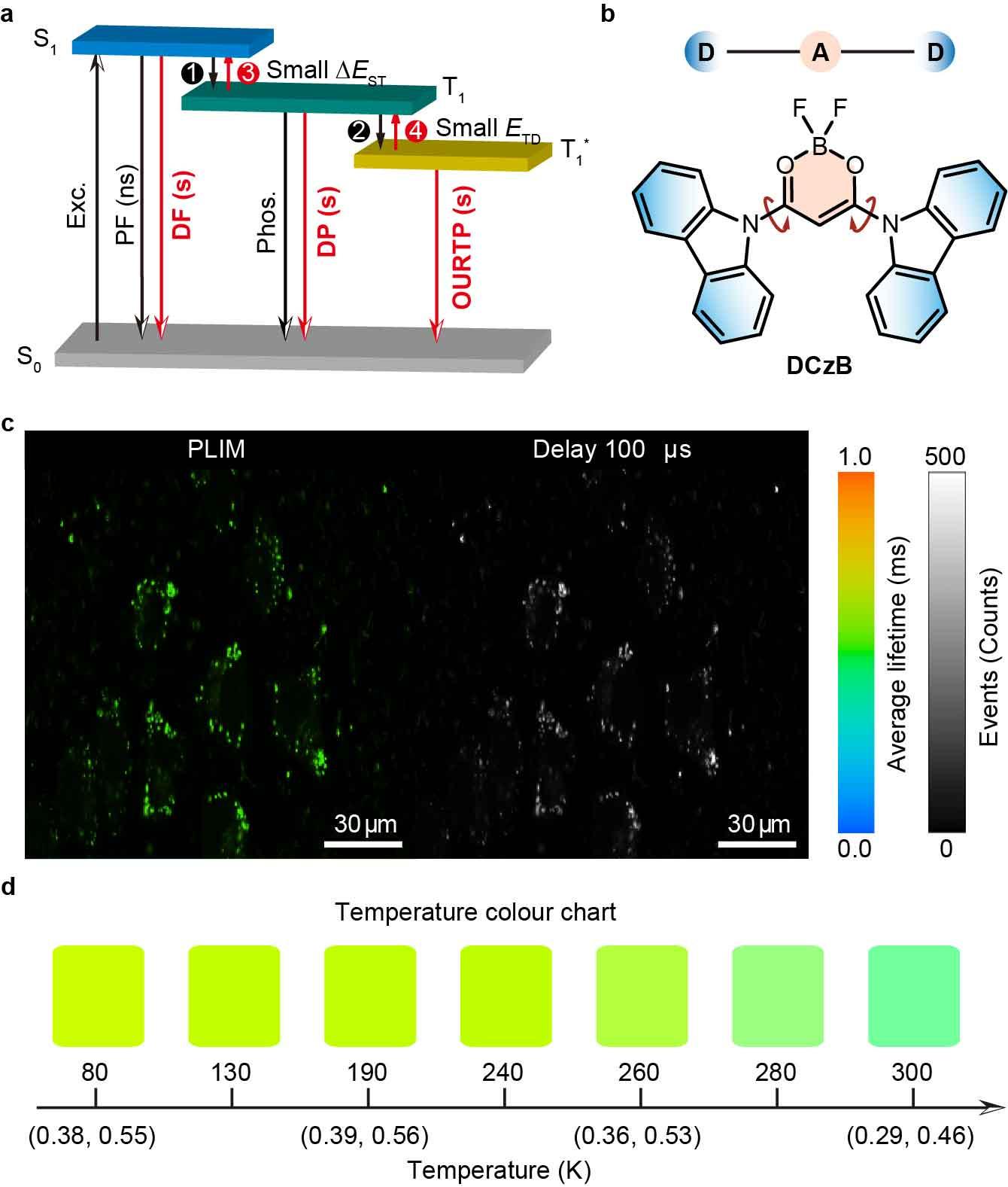 Fig. 1 | a, Proposed mechanism of highly efficient TAA. b, Design of TAA molecules based on difluoroboron β-diketonate and carbazole in a twisted D–A–D architecture. c, PLIM and time-gated images. d. Temperature-dependent color chart with corresponding CIE coordinate showing the ability of DCzB crystals in visual sensing of temperatures.