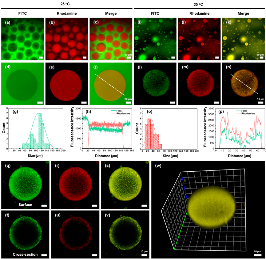 In this study, we develop a thermo-responsive ATPS (TR-ATPS) that allows regulating two-level compartmentalization through two-step phase separation. The TR-ATPS comprising thermo-responsive poly (N-isopropylacrylamide) (PNIPAM) and dextran (DEX) displays sensitive phase transition behaviors in response to temperature variations. In a PNIPAM (5 wt%)/DEX (5 wt%) solution, liquid membraneless compartments enriched in PNIPAM separate from the continuous DEX-rich phase at 25 ℃. When the temperature is increased to 35 ℃, the size of PNIPAM compartments decreases sharply from 56-145 μm to 14-60 μm, accompanied by the generation of small second-level compartments (~1 μm) at the interface (Fig. 1).