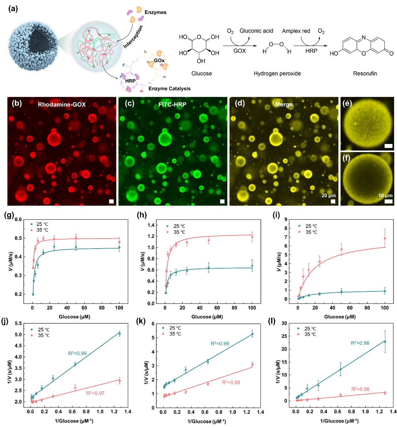 The second-step phase separation of the TR-ATPS is thermally reversible, according to the reconfiguration of PNIPAM chains between hydrophilic coils to hydrophobic globules. The transition temperature of the TR-ATPS is around 31 ℃, close to the human body temperature, rendering the system suitable for investigating biochemical reactions in vitro. As a demonstration, we introduce glucose oxidase and horseradish peroxidase into the TR-ATPS and observe their colocalization in the colloidosome-like compartments when the temperature is increased to 35 ℃. The enrichment of enzymes in the small second-level compartments with large surface area accelerates the tandem enzymatic reaction efficiency by approximately 7-fold (Fig. 2).