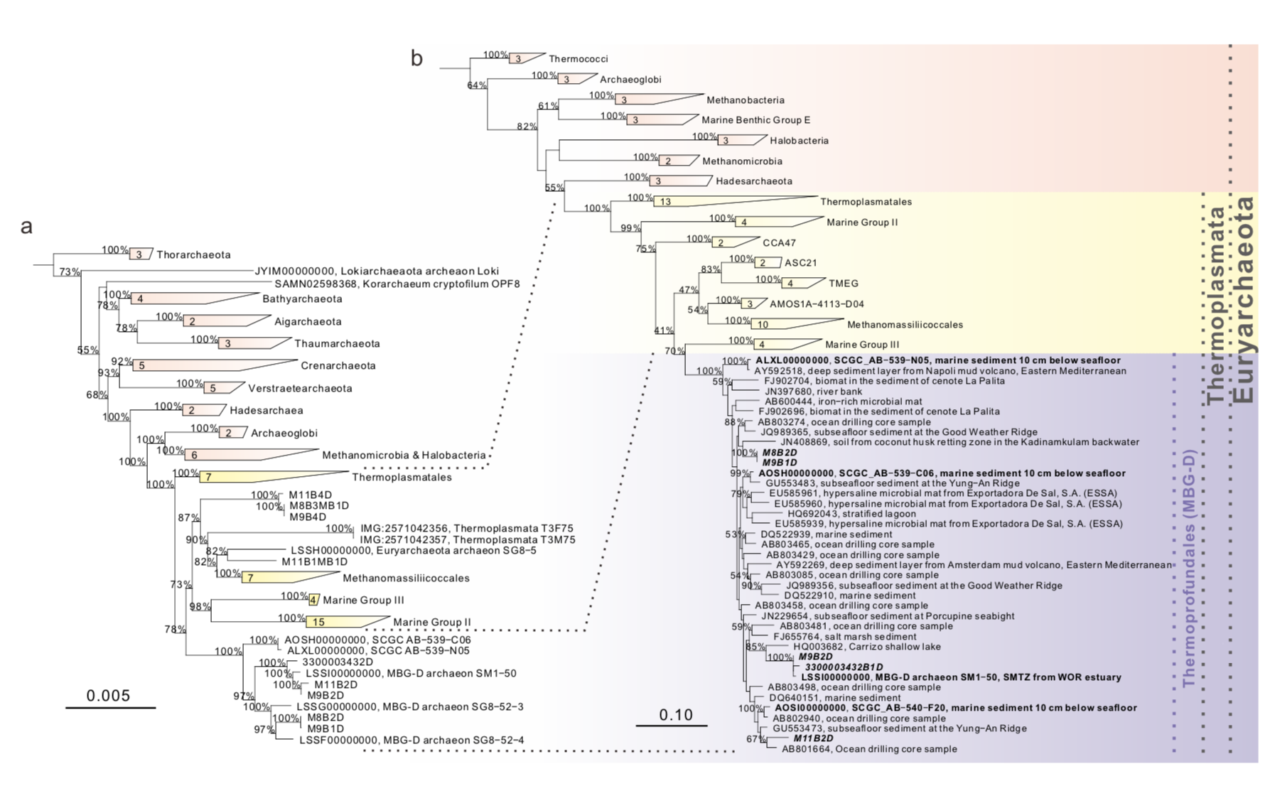 Meanwhile, based on four nearly complete metagenome-assembled genomes (MAGs) and corresponding metatranscriptomes reconstructed from mangrove and intertidal mudflat sediments, we provide insights on metabolic potentials and ecological functions of MBG-D archaea. Our results reveal MBG-D archaea as an important ubiquitous benthic sedimentary archaeal group with specific mixotrophic metabolisms. Based on the 16S rRNA gene and whole genome analysis, we proposed the name Thermoprofundales as a new Order within the Class Thermoplasmata.