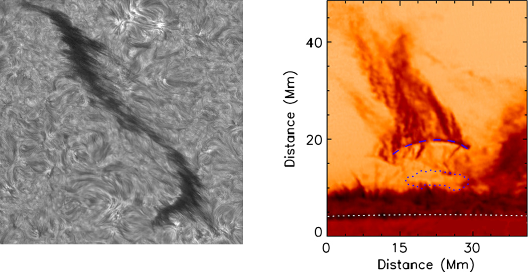 Figure 1. Left: A filament on the solar disk observed in Hα on 2018 July 23; Right: A prominence above the solar limb (white dotted line) observed in Hα on 2014 May 24. Both images were taken by the NVST telescope in Yunnan Astronomical Observatory, China.