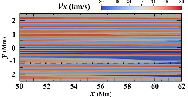 Again, just because of the randomized heating and chromospheric evaporation, the formed threads are pushed randomly, forming alternating-direction flows along the magnetic field lines, i.e., the so-called counterstreamings. Figure 3 displays the velocity distribution along the magnetic flux sheet. The alternating red- and blue-shifts represent the counterstreamings. For the cold filament threads, the streaming velocities are around 12 km s-1, which is comparable to observations. Furthermore, based on simulation results, we predict that counterstreamings with velocities up to 100 km s-1 exist in the hot coronal plasma between filament threads, which we call interthread counterstreamings.