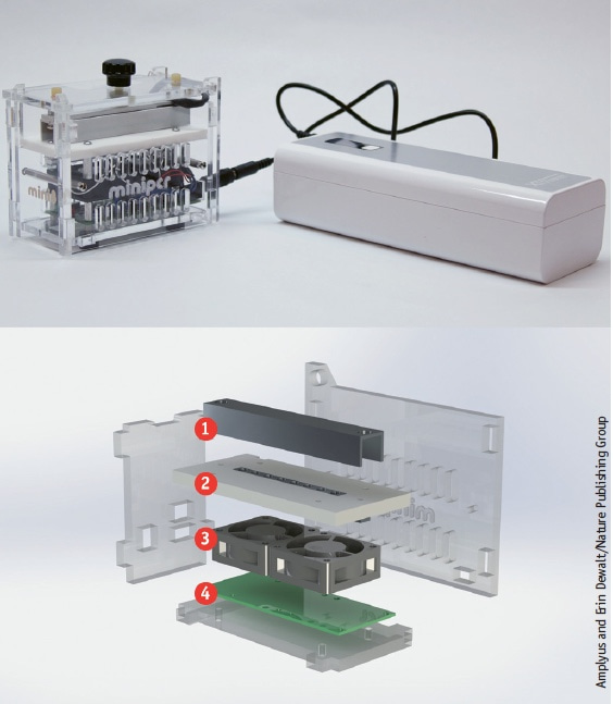 Amplyus designed and built miniPCR. Here, the layers show the heating lid (1), heating block for eight DNA samples (2), high-speed cooling fan (3) and open-source electronics (4).