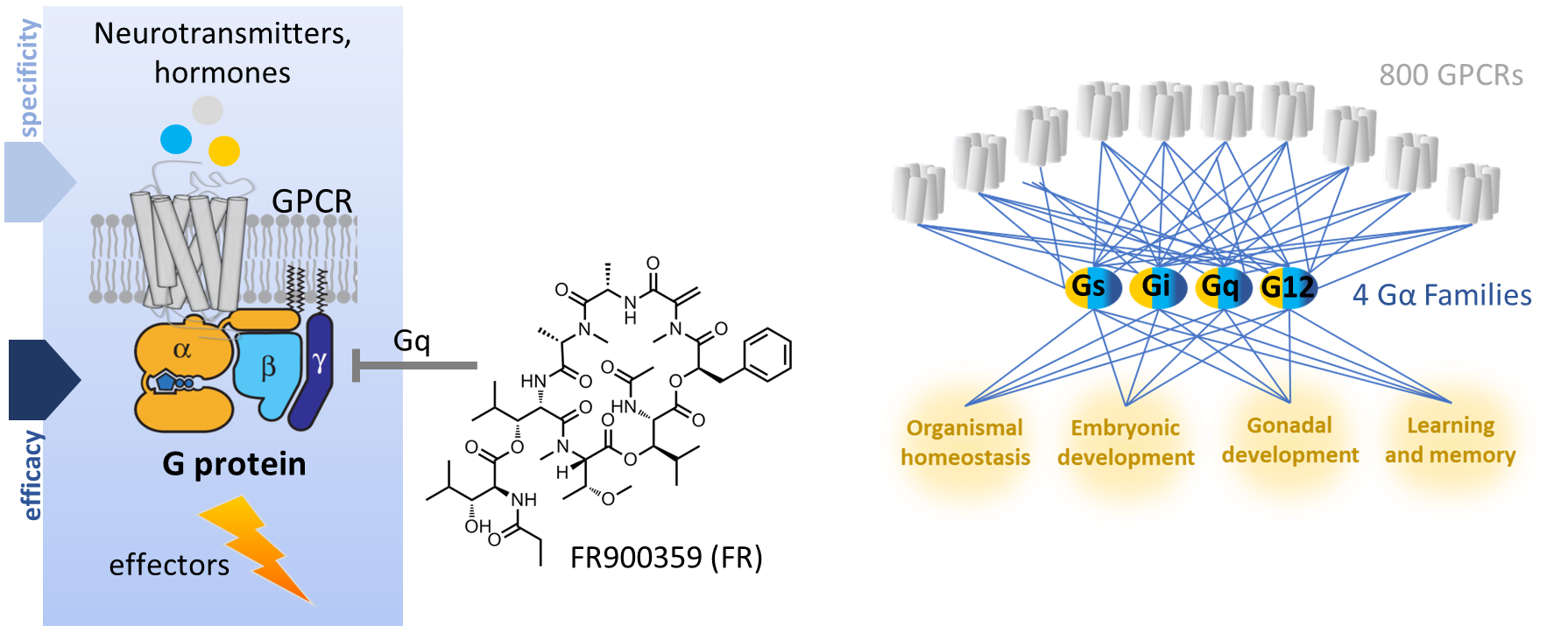 Figure 1. Left: FR inhibits Gq, a major family of G proteins, with high potency and selectivity. Right: As there are >800 GPCRs, but only four major G protein families, inhibition of Gq results in blockage of many GPCR-related signaling cascades. Picture credit: Evi Kostenis