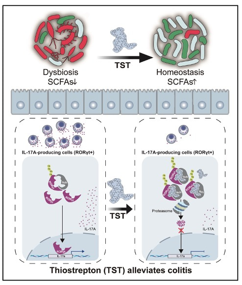 Many findings of this study were interesting to us. On the one hand, TST exerts its direct immunomodulatory effects to suppress IL-17A production by targeting RORγt for ubiquitination and degradation. On the other hand, TST exerts its antimicrobial effects to ameliorate colitis by modulating gut microbiota dysbiosis. Therefore, we demonstrated, for the first time, TST plays a dual role in protecting mice from experimental colitis (Figure 1). These new insights hopefully help to understand better about the pathogenesis of colitis and screen for therapeutic drugs for colitis. Our next plan is to determine whether TST is a molecular glue degrader to facilitate the assembly of RORγt and Itch.