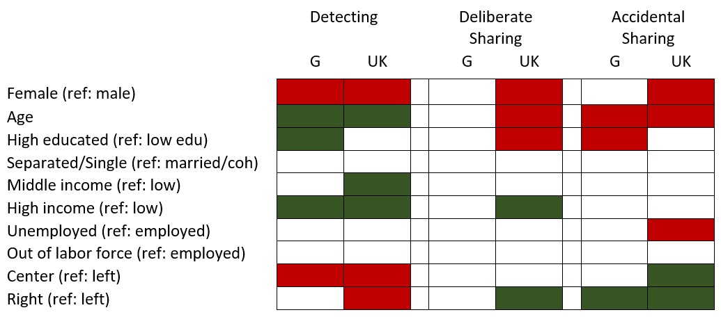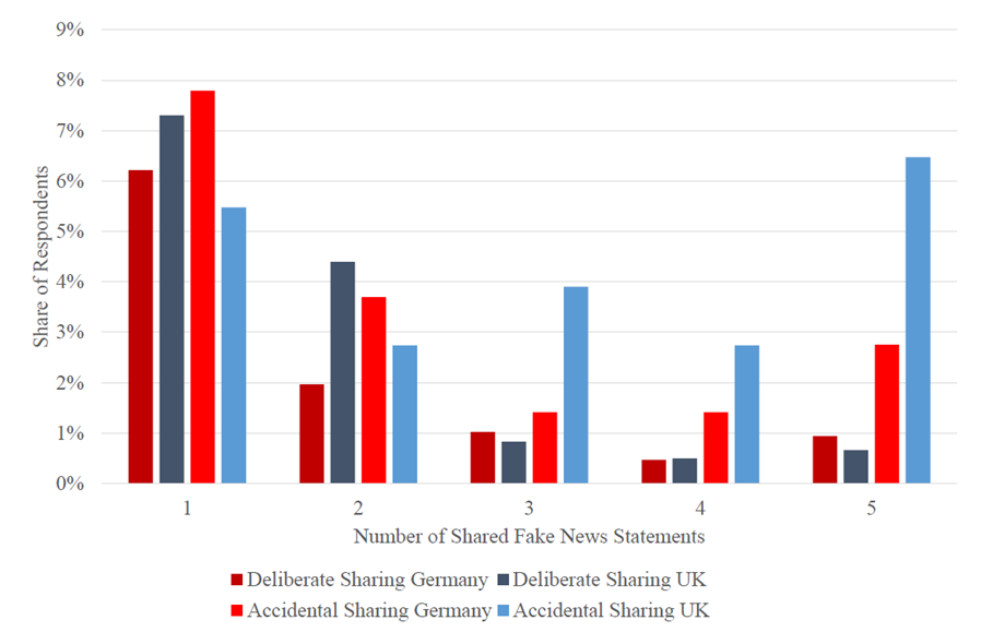 In a recent research paper, we used large-scale surveys in Germany and the UK to show that older, male, high-income, and politically left-leaning respondents are particularly good at recognizing fake news. Accidental sharing of fake news is much more common than deliberate sharing regarding further dissemination. Accidental sharing of fake news is significantly more common in the politically right-wing spectrum and decreases with age. Deliberate sharing is found more frequently than average among younger UK respondents.