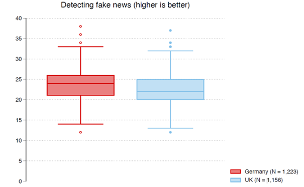 For the research project, close to 2400 people in Germany and the UK were studied in December 2021 about their fake news behavior. In the online survey, we presented the respondents with ten headlines published online, of which five were fake news and the other five described correct facts. The fake news headlines included, for example, "Pope Francis shocks the world: support for Donald Trump as president." An accurate headline was "Donald Trump nominated for Nobel Peace Prize 2021.” The headlines were presented as plain text, without source citation or illustration, to avoid influencing participants with further information or signals. We asked subjects to rate whether they were more likely to think the headline was true or false. From these assessments, we constructed an index of individual ability to identify fake news for each subject. Those who could correctly identify all headlines as accurate or fake news and were confident in their judgment would have reached the maximum index value of 40. Those who misidentified all headlines but still felt confident in their judgment would have achieved an index value of zero. As Fig.1 shows, the extreme values did not occur in either Germany (left) or the UK (right). On average, participants scored 23 points - marginally more in Germany than in the UK. As the figure also shows, there is considerable variation in identifying fake news.
