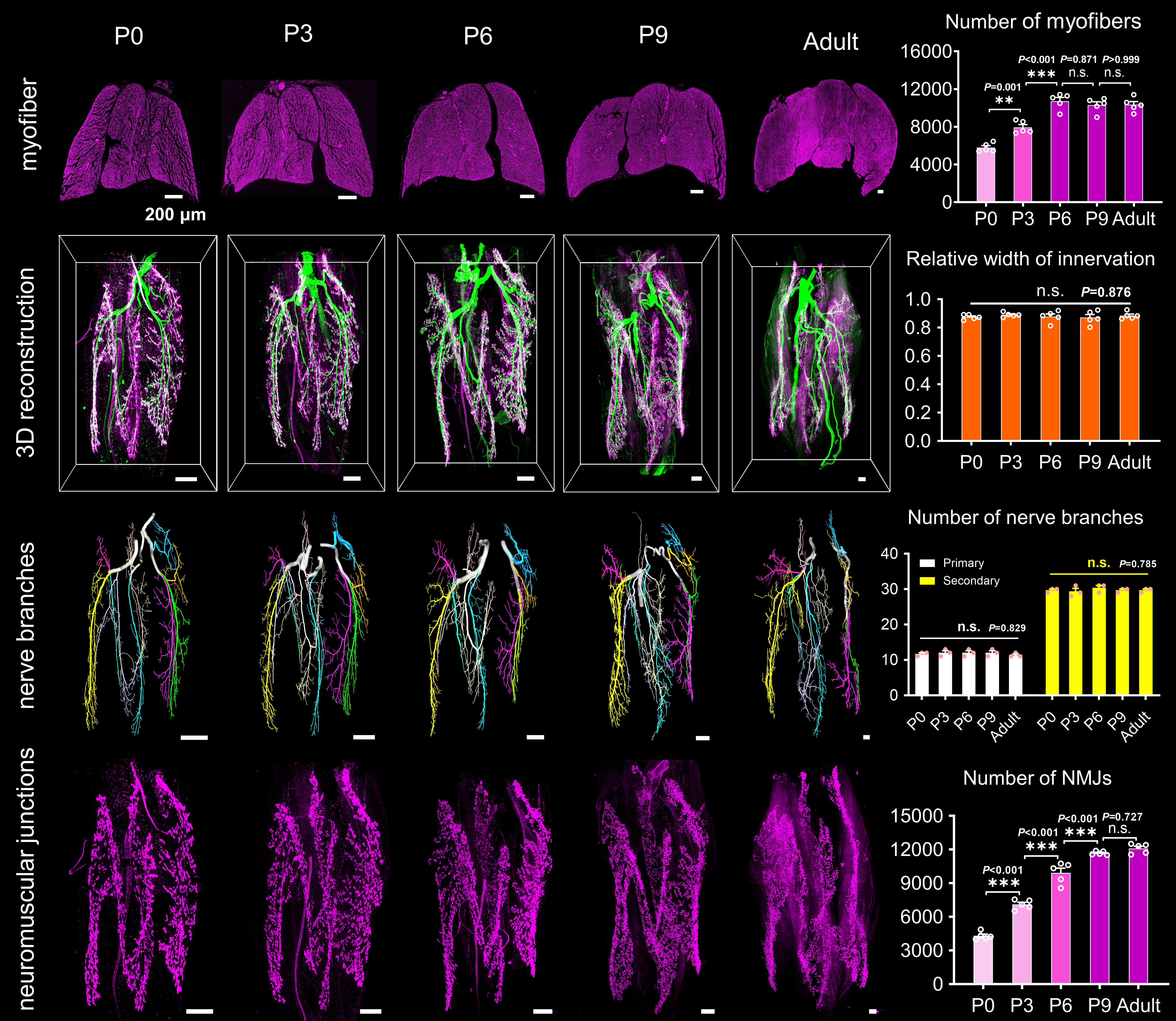 Subsequently, we scrutinized the structural development of intramuscular nerves and myofibers in the cervical, forelimb, and hindlimb muscles during motor development. For muscle development, we analyzed the percentages of myofibers with central myonuclei, percentages of proliferative cells, and myofiber numbers in developing muscles at different times quantitatively. We found that myofiber hyperplasia of forelimb and hindlimb muscles was continued until around P3 and P6, while that of cervical muscle ended at birth. For neural development, we examined the 3D structural features of the nerves and NMJs in different muscles by combining the FDISCO method and light-sheet microscopy while detecting mRNA expression of collagen XXV related to axonal arborization using qRT-PCR. The results revealed continued axonal arborization and neuromuscular junction formation of forelimb and hindlimb muscles until around P3 and P9; feature alterations of the cervical muscle ended at birth.
