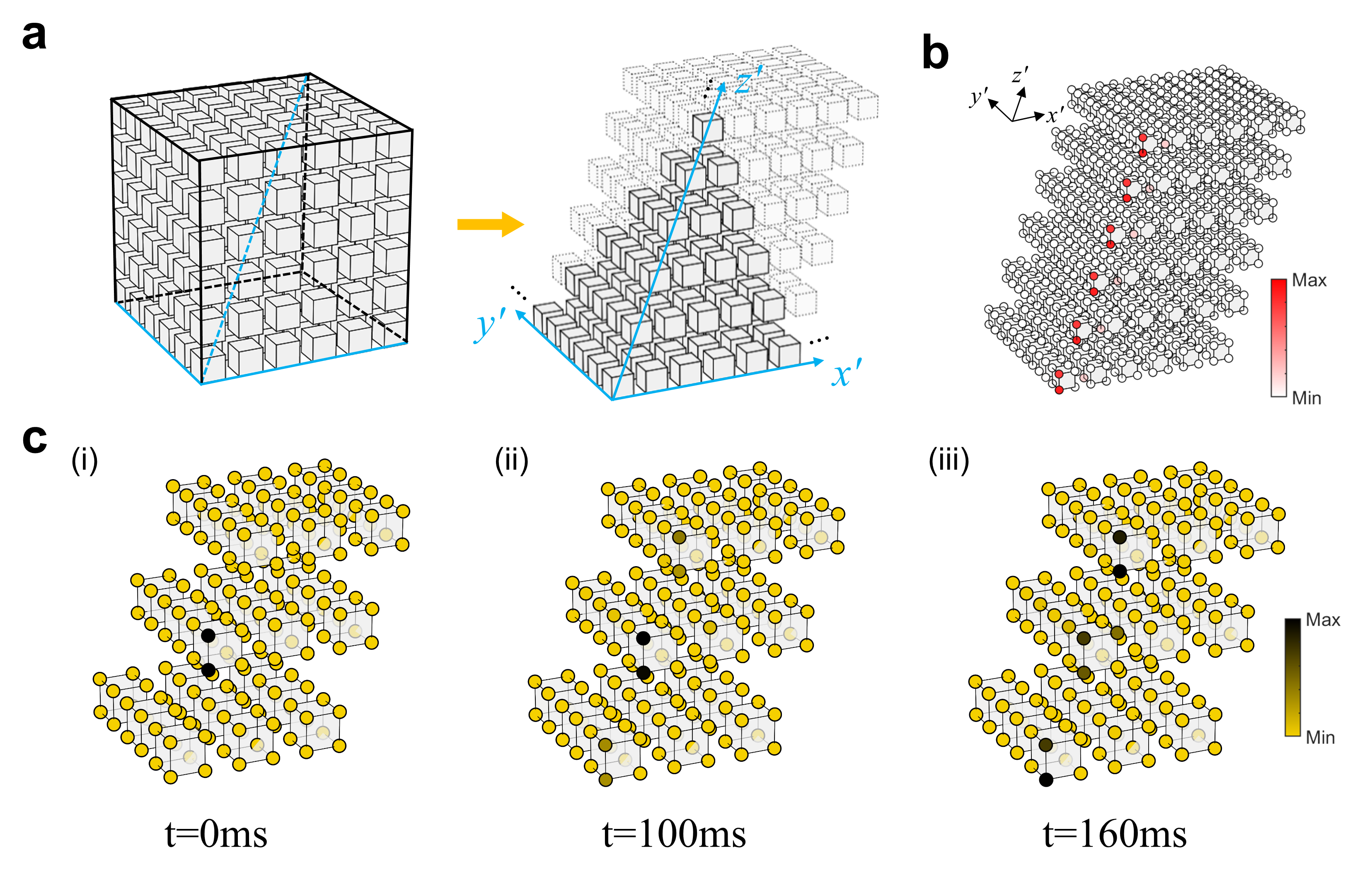 To verify the higher-order boundary states, an corresponding circuit network is fabricated which consists of 3×3×3 unit cells with edges along the body diagonal. The voltages at the nodes are stimulated to observe the evolution of state on the outermost two sites of the cell located on the hinge at t = 0 ms, which is shown in Fig. 2c(i). The experimental results of the circuit wavepacket at t = 100 ms and 160 ms are displayed in Figs. 2c(ii) and 2c(iii). It can be seen that the electronic density of the state indicated by the circuit voltages diffuses along the z' direction within a finite time. Regardless of a small amount of voltage signals diffusing to the surface sites due to the influence of circuit disorders, most voltage signals occupy the outermost sites of the unit cells on hinge all the time, which indicates that the one-dimensional hinge state is a mode isolated from the bulk.