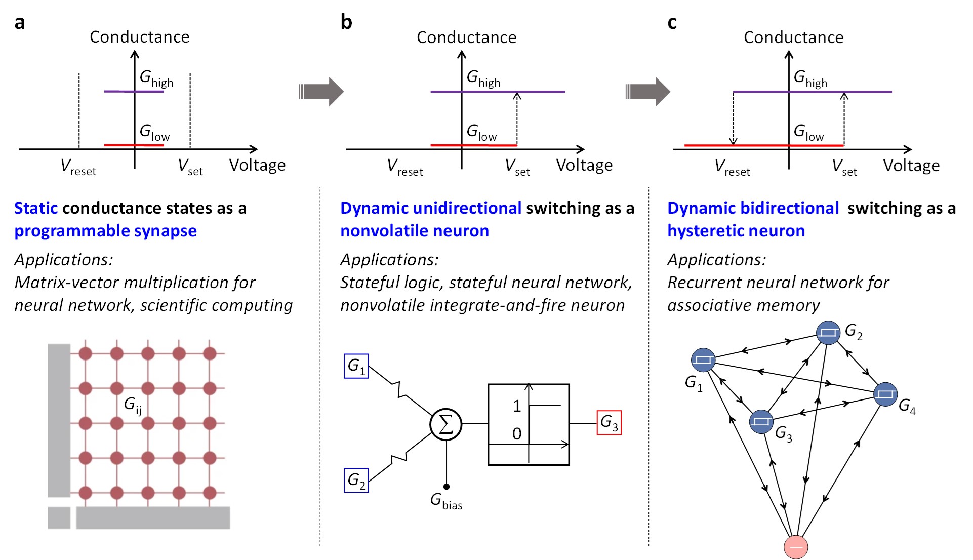 Level 3: The static conductance states and the dynamic switching between two states are exploited, resulting in a new concept of neuron – hysteretic neuron (Fig. 1c), which is proposed in our recent work “An emergent attractor network in a passive resistive switching circuit”.
