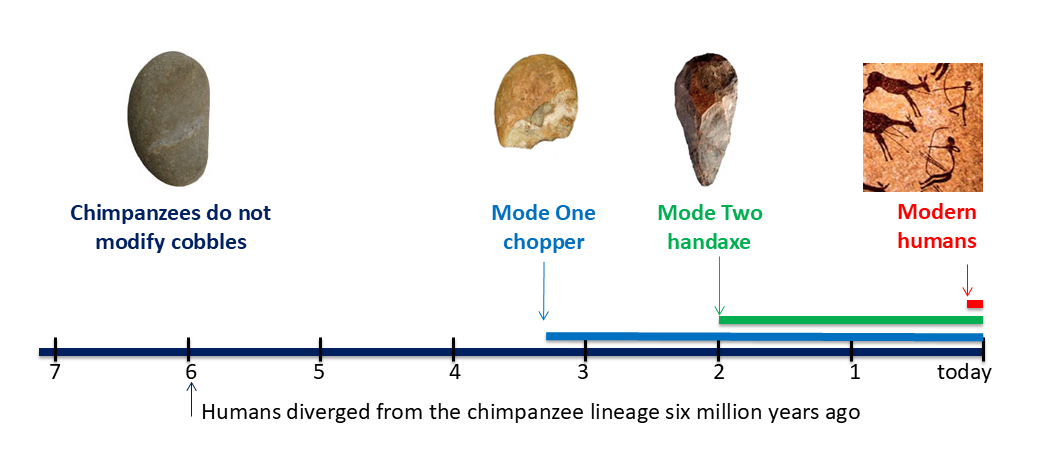 From a neurological perspective, the manufacturing of stone tools is strongly related to the Modifier Mechanism of language comprehension. A handaxe cannot be manufactured by randomly striking of a cobble. Stone tools manufacturing requires a mental template in the mind of a toolmaker that determines the eventual form of the tool. Even if one has previously seen a handaxe and could recall it from memory, this memory cannot serve directly as a mental template. Rather, it must be mentally modified/re-sized, to account for the unique features of each cobble. This neurological mechanism for deliberate re-sizing a mental object is also essential for comprehension of sentences that communicate modification of an object’s size (e.g., “give me a bigger stone” or “give me a smallest stick”). Consequently, the manufacturing of Mode One choppers approximately 3.3 million years ago marks the emergence of the Modifier Mechanism. The gradual evolution of stone tool technology reflects the progressive refinement of this mechanism. The transition from crude Mode One choppers to symmetrical Mode Two handaxes with extended cutting edges around 2 million years ago provides a confirmation of the steady development of the Modifier Mechanism of language comprehension.