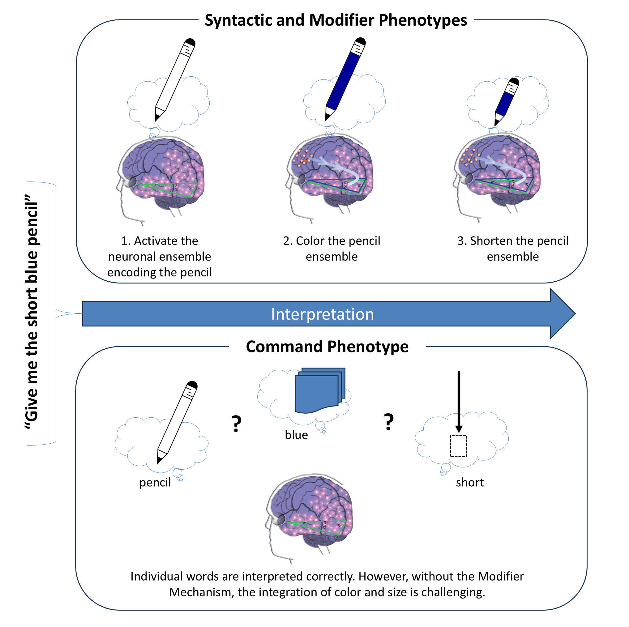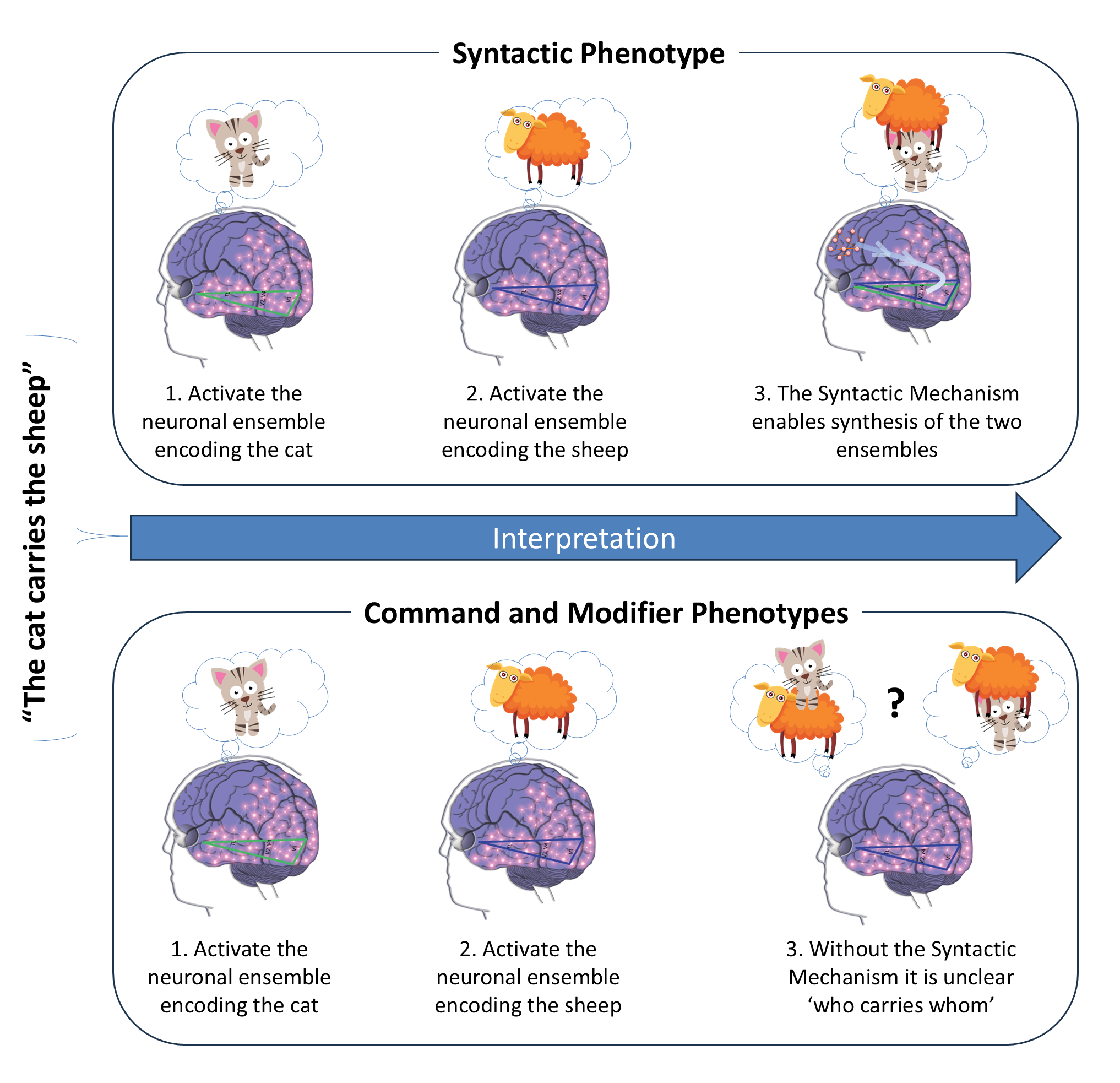 The Command Mechanism is the only one demonstrated in non-human animals; no animal has shown the ability to understand instructions like "Give me a long red pencil" or comprehend a fairytale. Thus, our findings are consistent with Chomsky's hypothesis regarding the existence of a uniquely human language comprehension mechanism. Furthermore, our results refine Chomsky's hypothesis by distinguishing two uniquely human language comprehension mechanisms: the Modifier Mechanism and the Syntactic Mechanism. More importantly, we present a neurological model of these mechanisms, offering a comprehensive framework for understanding human language comprehension.