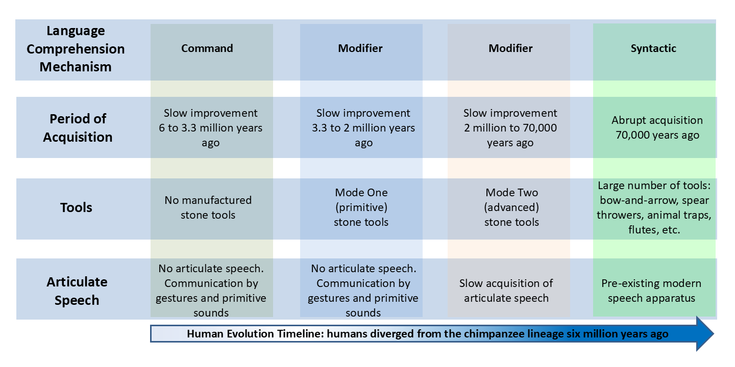 One of the most surprising findings of our research is the relationship between the acquisition of articulate speech and various mechanisms of language comprehension. Multiple lines of evidence suggest that the development of the articulate speech apparatus began around 2 million years ago, indicating that the uniquely human modifier mechanism of language comprehension was acquired prior to the emergence of articulate speech. This raises the intriguing possibility that for over a million years, our ancestors relied on hand gestures for communication of modifiers such as size and number. Moreover, it suggests that the Modifier Mechanism may have played a crucial role in facilitating the acquisition of articulate speech. It is likely that it was the gradual neurological development of the Modifier Mechanism, communicated through gestures, that set humans on the path to articulate speech and eventually to the acquisition of syntactic language.