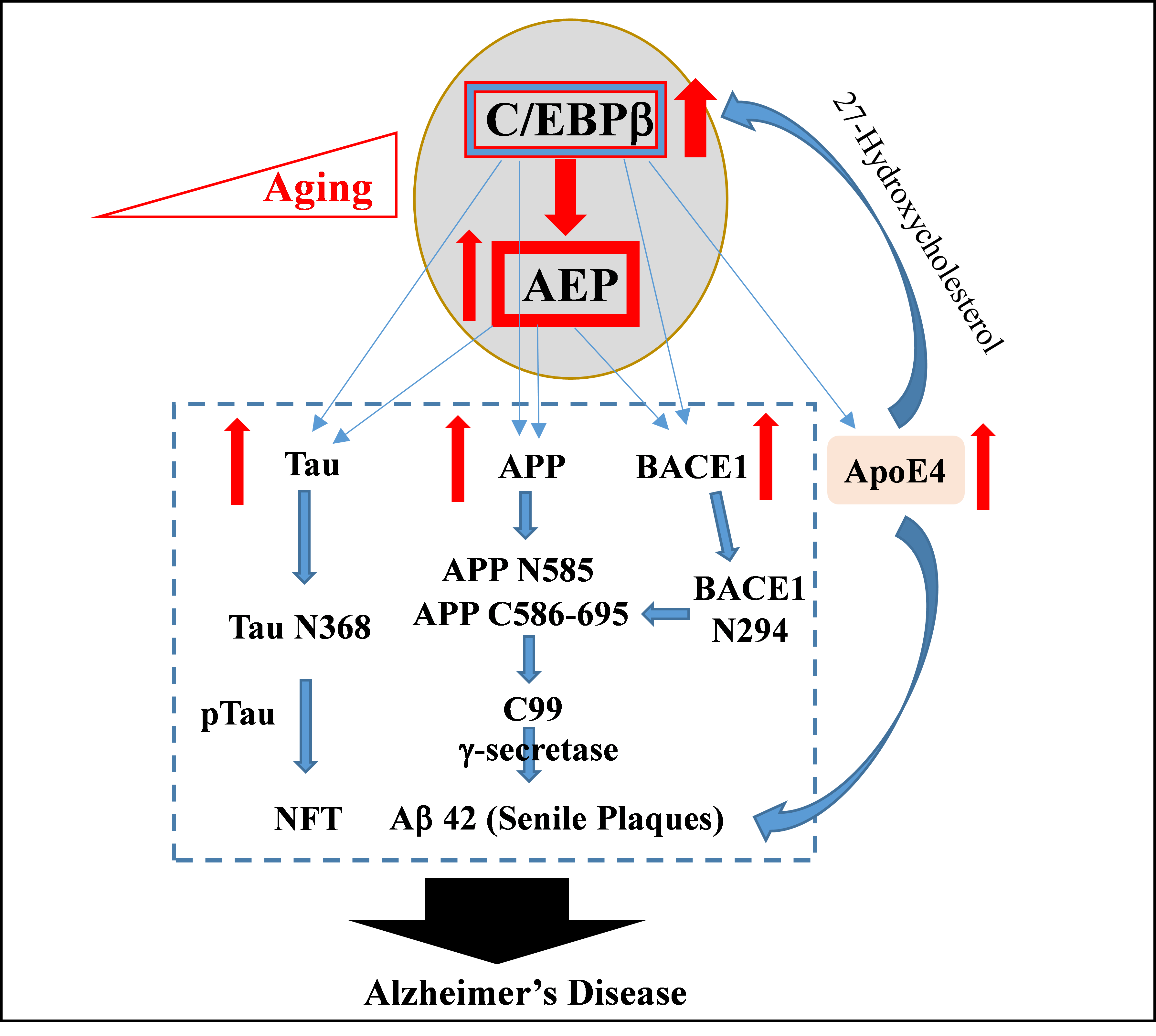 Over the years, our group has established that the C/EBPβ/AEP pathway is a core regulatory mechanism triggering the occurrence and development of AD. On one hand, C/EBPβ, a crucial transcription factor for AEP, regulates the expression of genes essential for AD pathologies, including APP, microtubule-associated protein Tau (MAPT) and BACE1 (β-site amyloid precursor protein cleaving enzyme) (1, 2). On the other hand, it also plays an essential role in mediating transcription of AEP, which acts as a novel δ-secretase that cleaves upregulated substrates such as APP, Tau, and BACE1, generating fragments like APP N585, APP C586, BACE1 N294 and Tau N368, further accelerating the pathological formation of Aβ and Tau (3, 4). Additionally, we have found that C/EBPβ selectively promotes ApoE4 expression in neurons in AD patients, leading to Aβ clearance impairment and increased aggregation (5). ApoE4 is well known as a primary genetic risk factor for sporadic AD. Though ApoE4 is physiologically expressed in astrocytes and secreted, mounting evidence shows that ApoE4 is also expressed in neurons under stresses or pathologically (6, 7). Interestingly, ApoE4 can also synergistically activate the CEBPβ/AEP pathway through feedback with 27-hydroxycholesterol, exacerbating AD pathologies (8). Based on these findings, we hypothesize that ApoE4 elevation in neurons may drive the pathogenesis of AD by activating the CEBPβ/AEP pathway.