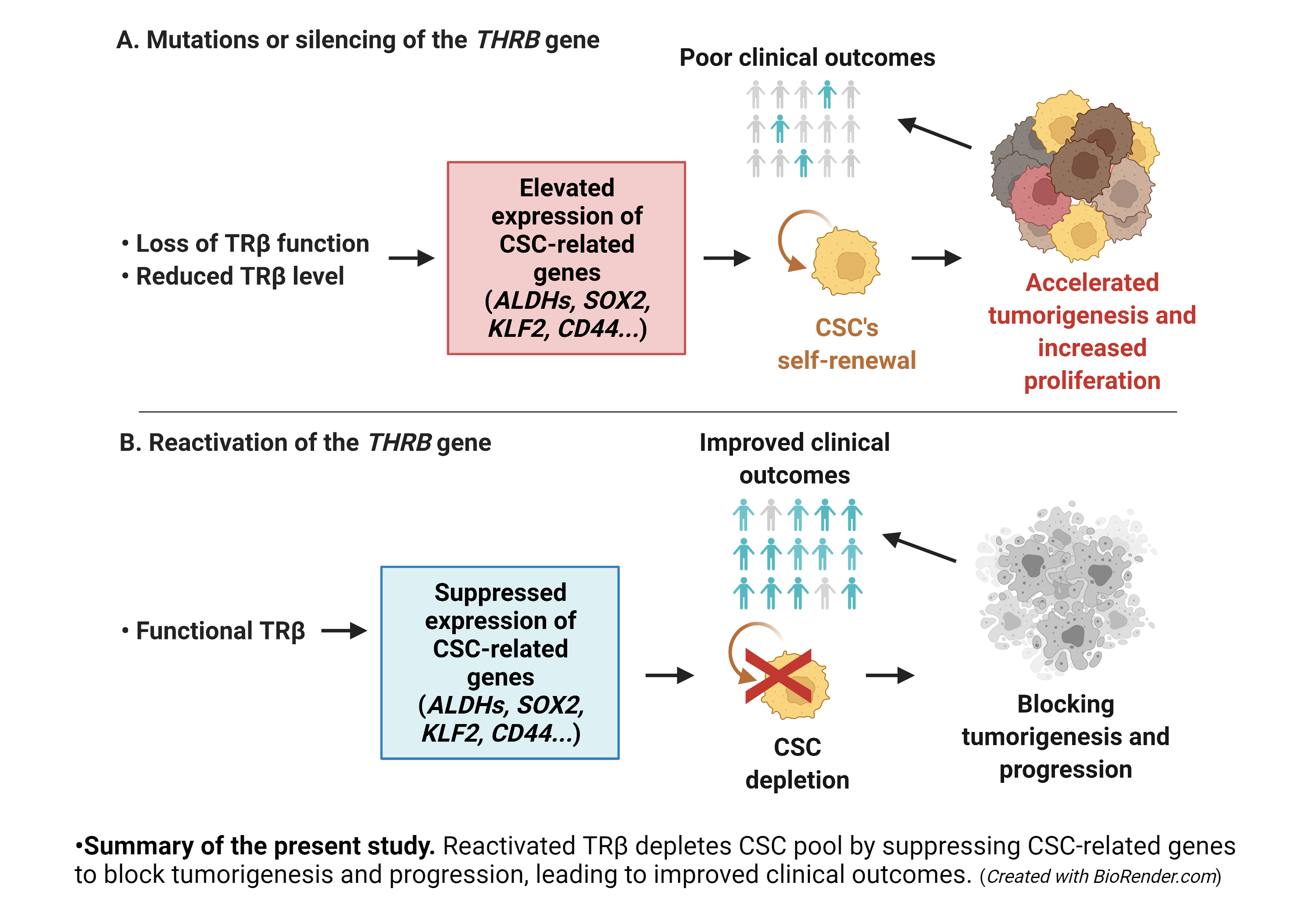 Together, these observations suggest that TRβ can function as a suppressor of CSC in human cancers. We therefor propose that TRβ be recognized as a newly identified transcription factor that is capable of suppressing CSC activity and of preventing tumorigenesis. Our observations provide strong evidence that targeting of TRβ and its downstream signaling is a promising treatment strategy for blocking cancer progression and for addressing the challenges of therapeutic resistance and cancer reoccurrence.