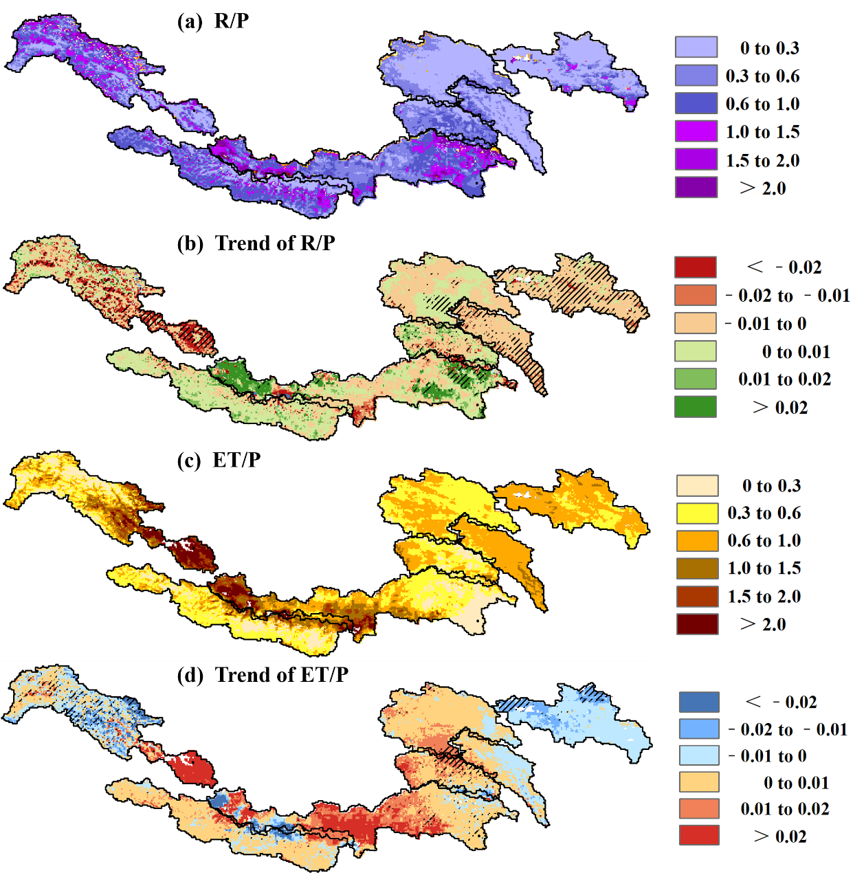 Figure 1. Hydrometeorological patterns across major headwater regions of TP during 1998-2017. (a-b) The ratio of R/P and its trend. (c-d) The ratio of ET/P and its trend. The shadow denotes that the trend has undergone statistical significance testing. The two ratios were derived from both the new TPRED and TPFMD precipitation data9.