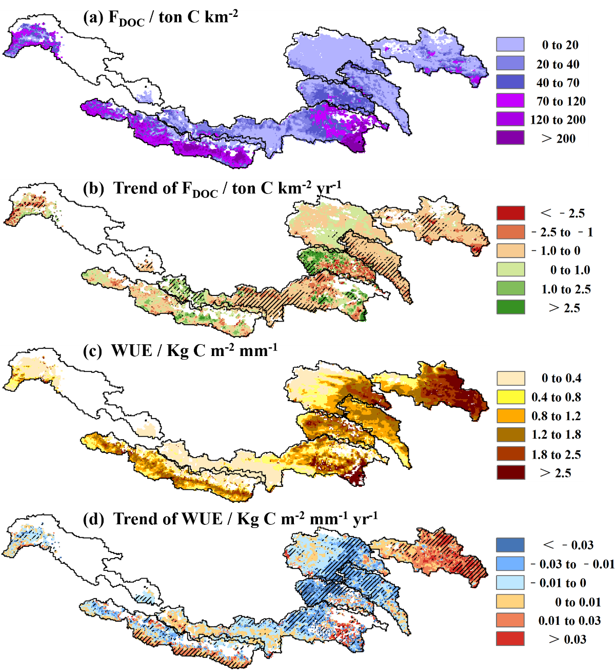 Figure 2. Carbon transport patterns across major headwater regions of TP during 1998-2017. (a-b) The FDOC and its trend. (c-d) The WUE and its trend. The meaning of shadow is similar to Fig.1. We calculated FDOC and WUE using the TPRED, combined with the NIRv GPP dataset10 and watershed slope data (from the model input). The respective formulae applied were FDOC = 0.004×runoff + 0.095×GPP – 8.76×slope102 and WUE = GPP/ET104.