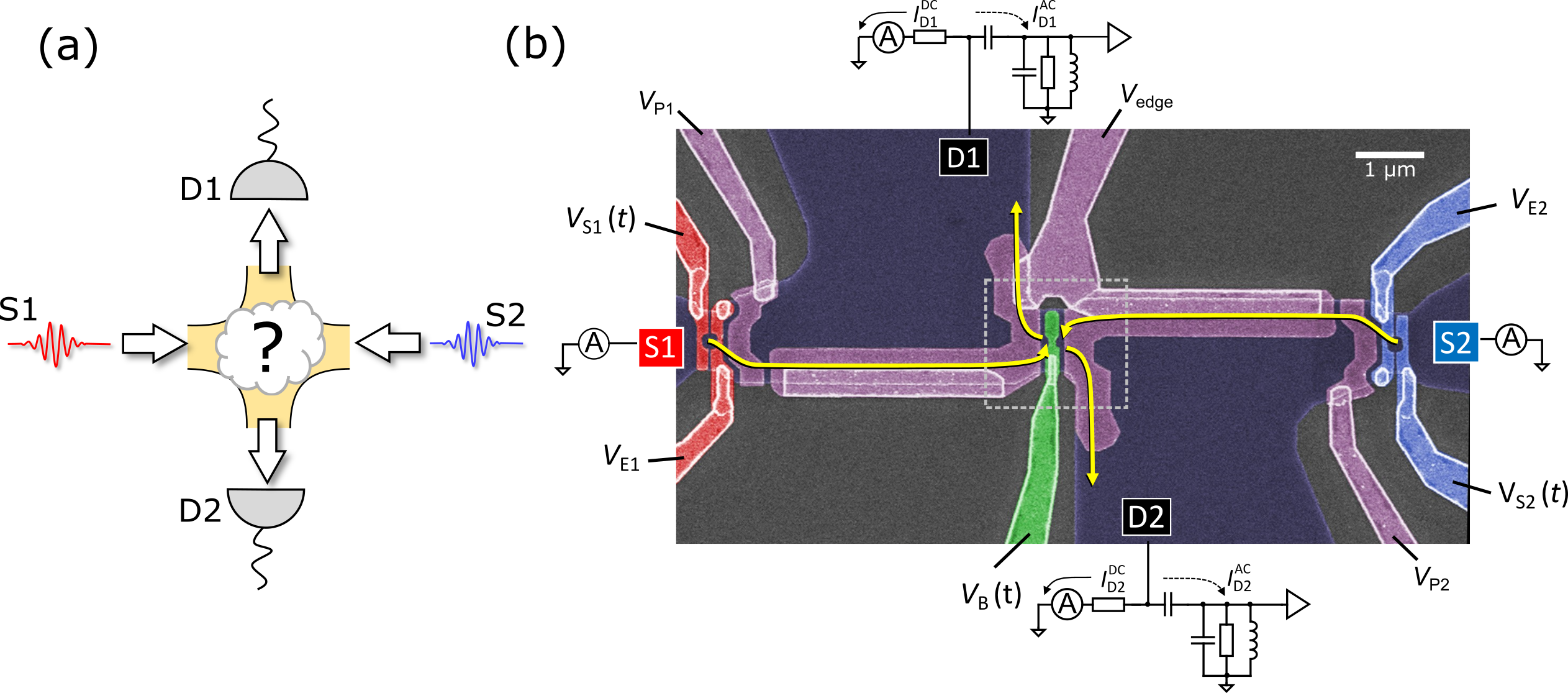 To explore this possibility, we developed the electron collider shown in Figure 1b. This uses surface gates on a GaAs heterostructure to define pumps that support high energy (>100 meV) emission and well-defined emission timing (<5 ps). We use this device to detect the outcomes of electron collisions between electrons of equal energy, but with varying arrival time Δt = t2 - t1 , which determines whether electrons collide or miss each other. We also vary the height of the barrier EB used as a beam splitter, a component which typically provides information on electron energy [4]. For readout, we measure the mean current distribution and the shot noise fluctuations. Taken together, these enable a very detailed analysis of the detector collision statistics Pnm, the probability of electrons leave in the same (P02 or P20) or different (P11) output channels (P20 + P02 + P11 = 1).