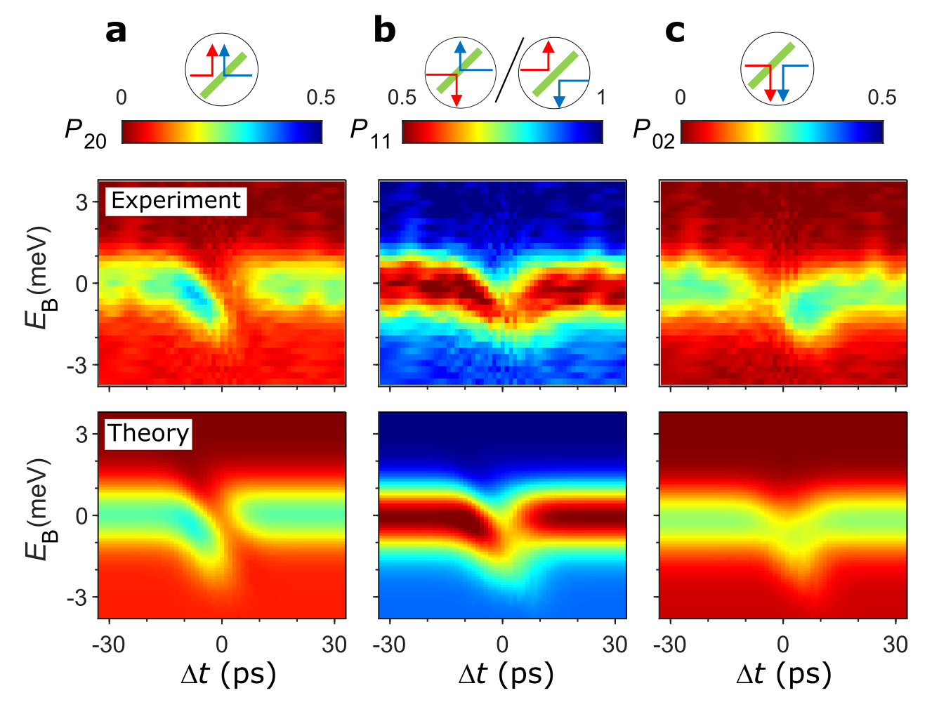 Looking at this effect in more detail, we see that in the trivial non-interacting case (e.g. |Δt| > 20 ps) at EB = 0 the statistics reflect a simple mixture of the four possible outcomes, P20 = P02 = 0.25 and P11 = 0.5. Near Δt=0, the barrier height EB at which this thresholds feature appears shift by ≈ 1 meV. There is also asymmetry such that P20≠P02. At some time delays, the minimum value of P11 > 0.5, which corresponds to a reduced noise. The properties of this data lead us to believe that this is an almost unscreened Coulomb collision.